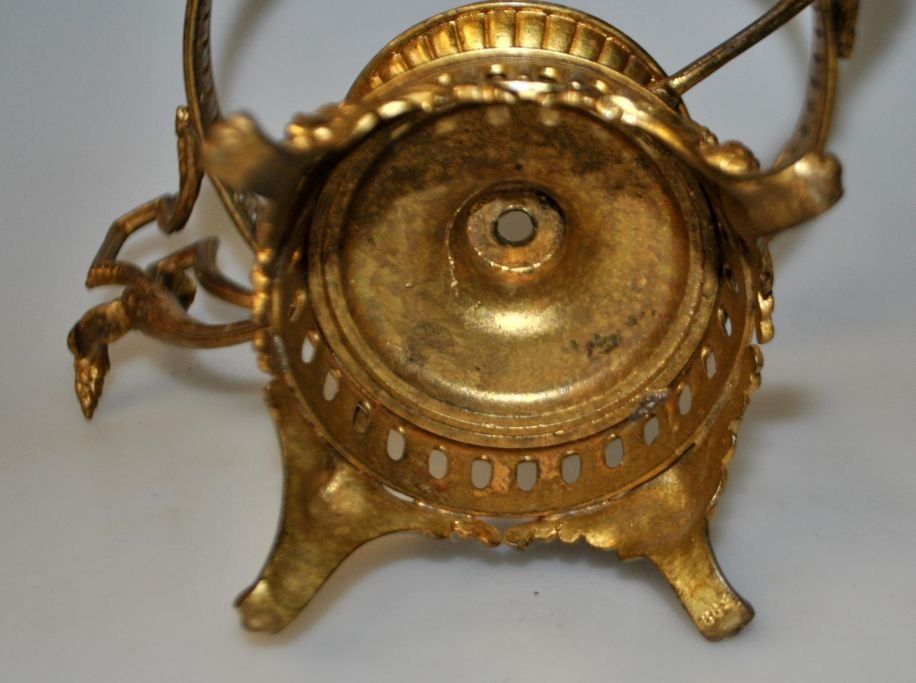 Fransk lueforgyldt opsats, 19. årh. Fod med fire ansigter. Dennembrundt kant med to hanke. Dekoreret med sløjfer. H.: 18 cm. Dia til skål: 14 cm. H.: 8,5 cm.
