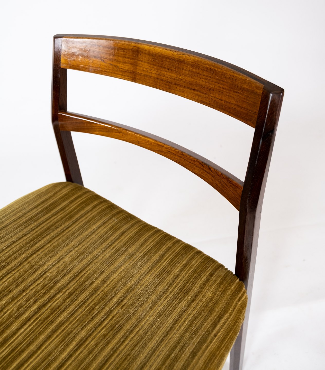 Et sæt spisestuestole i palisander og grønt stof, af dansk design fra 1960'erne, udstråler en tidløs elegance og enkelhed, der kendetegner den skandinaviske designtradition fra denne periode.