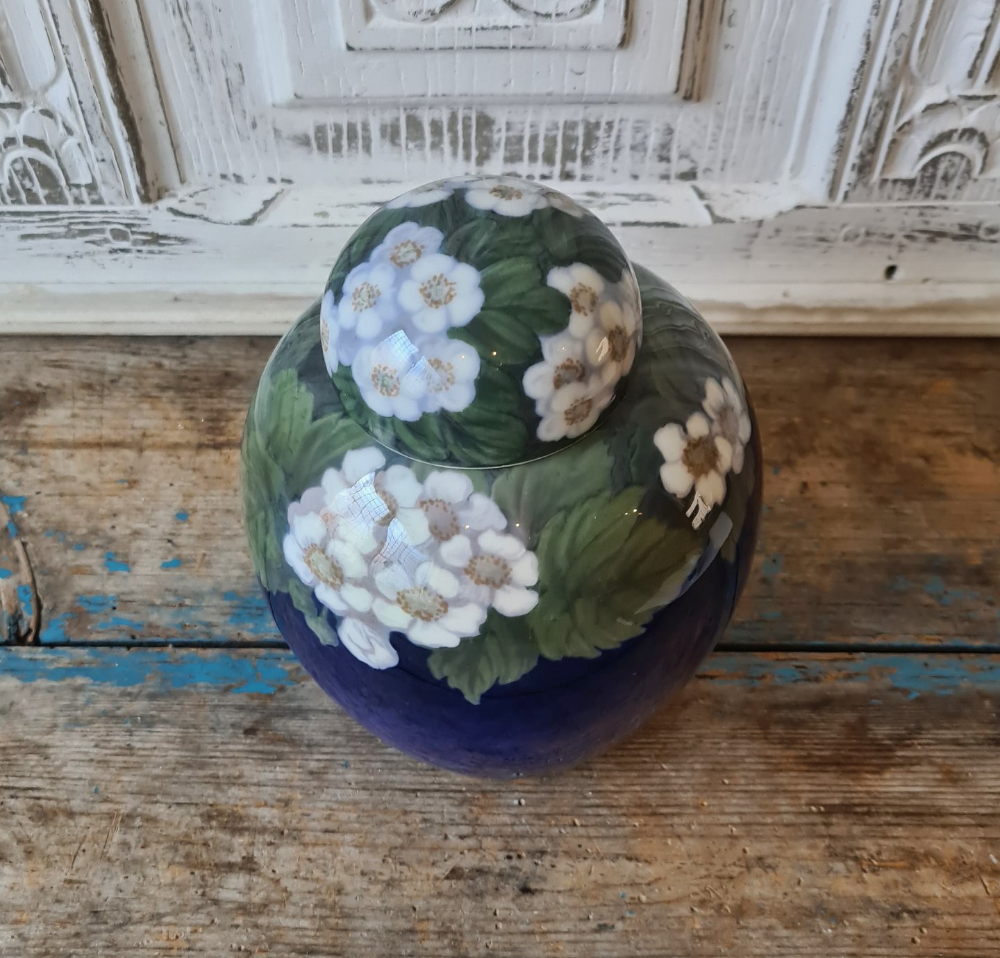 Royal Copenhagen Art Nouveau lågvase dekoreret med jordbærblomster, jordbær løv på blå bund. Bemalet af Else Hasselriis no. 2361/1242