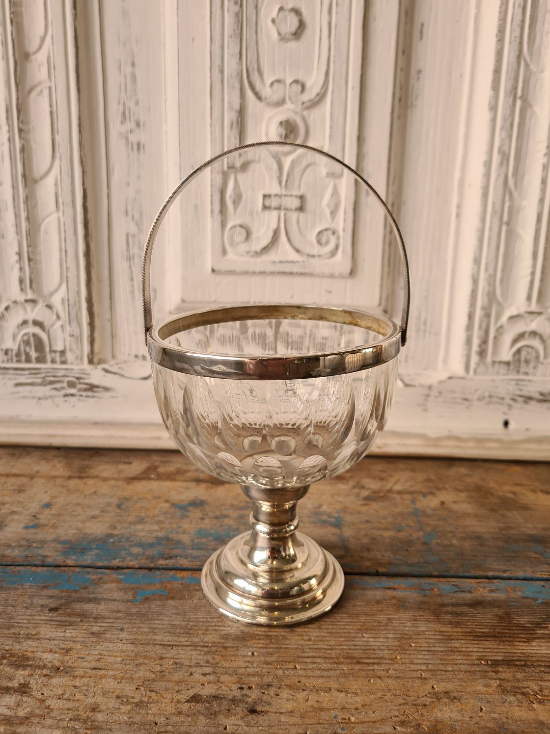 1800tals sukkerskål i klart glas med olivenslibninger på fod med forsølvet hank.