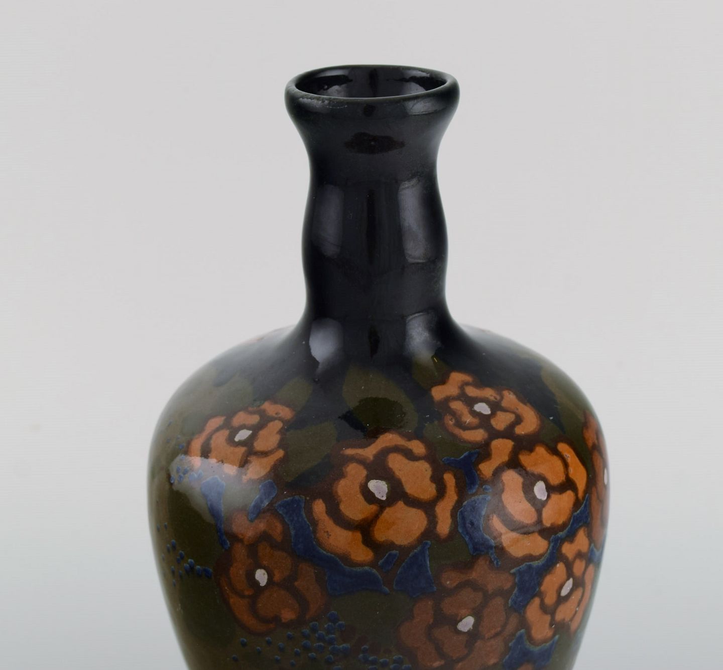 Arnhem, Holland. Antik art nouveau vase i glaseret keramik med håndmalede blomster og bladværk. Ca. 1910.