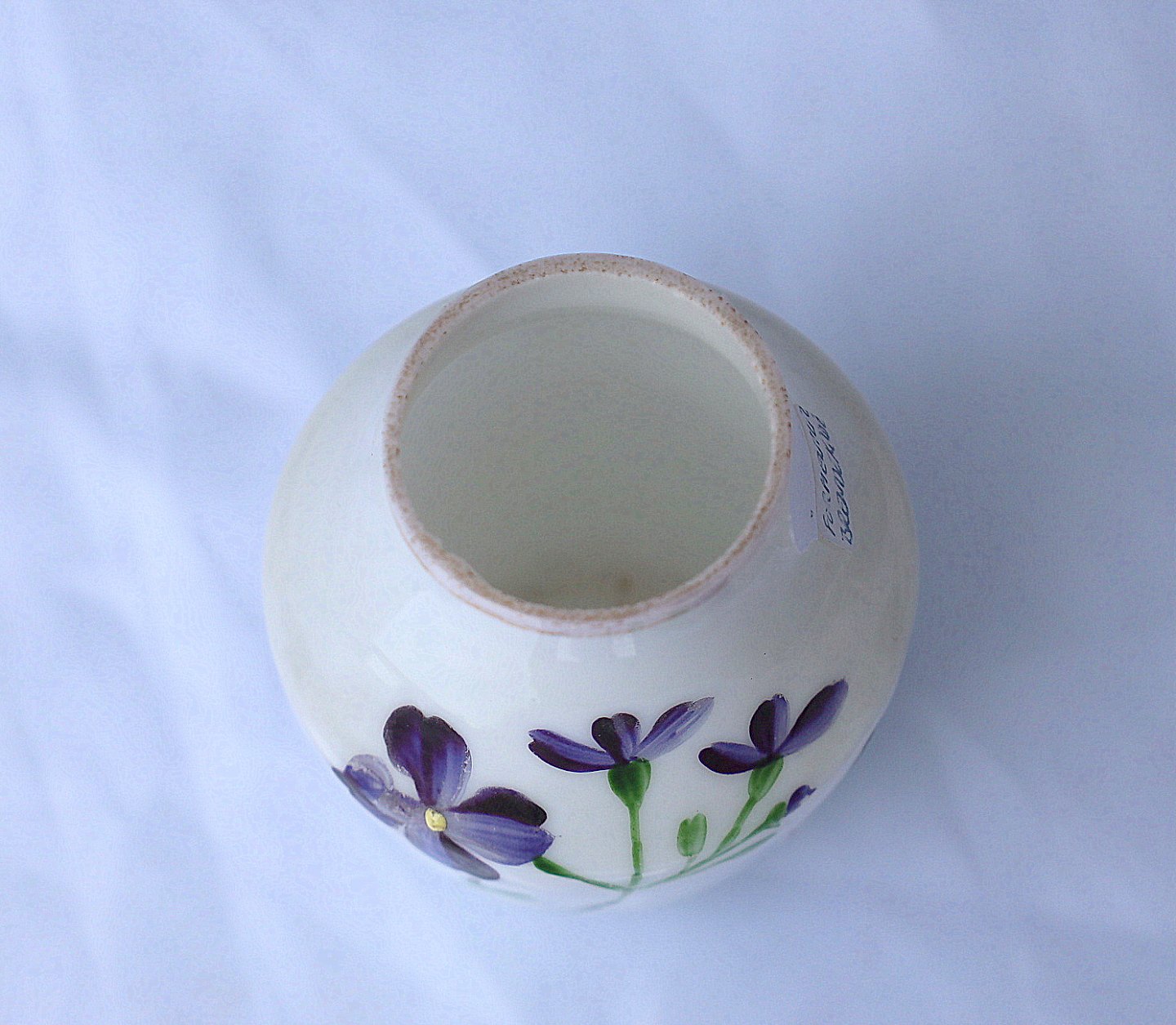 Fyens Glasværk. Lille opalhvid vase med afsprængt og planslebet rand. Vasen er fremstillet ca. år 1903, efter design af Brendekilde. På forsiden er vasen dekoreret med emaljemalet violer, og vasen er mundblæst.
