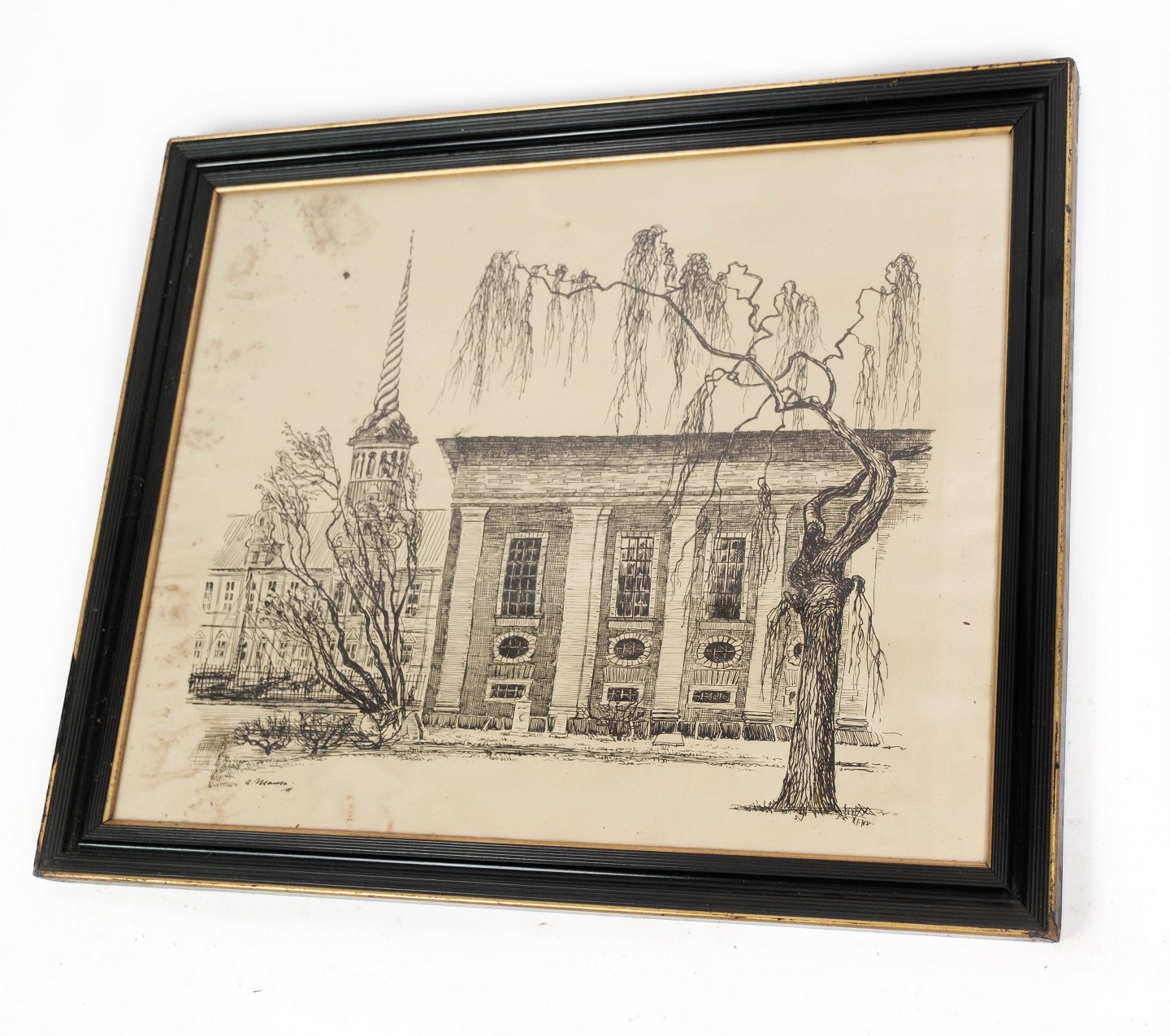 Tegning af gammel bygning med sort ramme fra 1940erne.