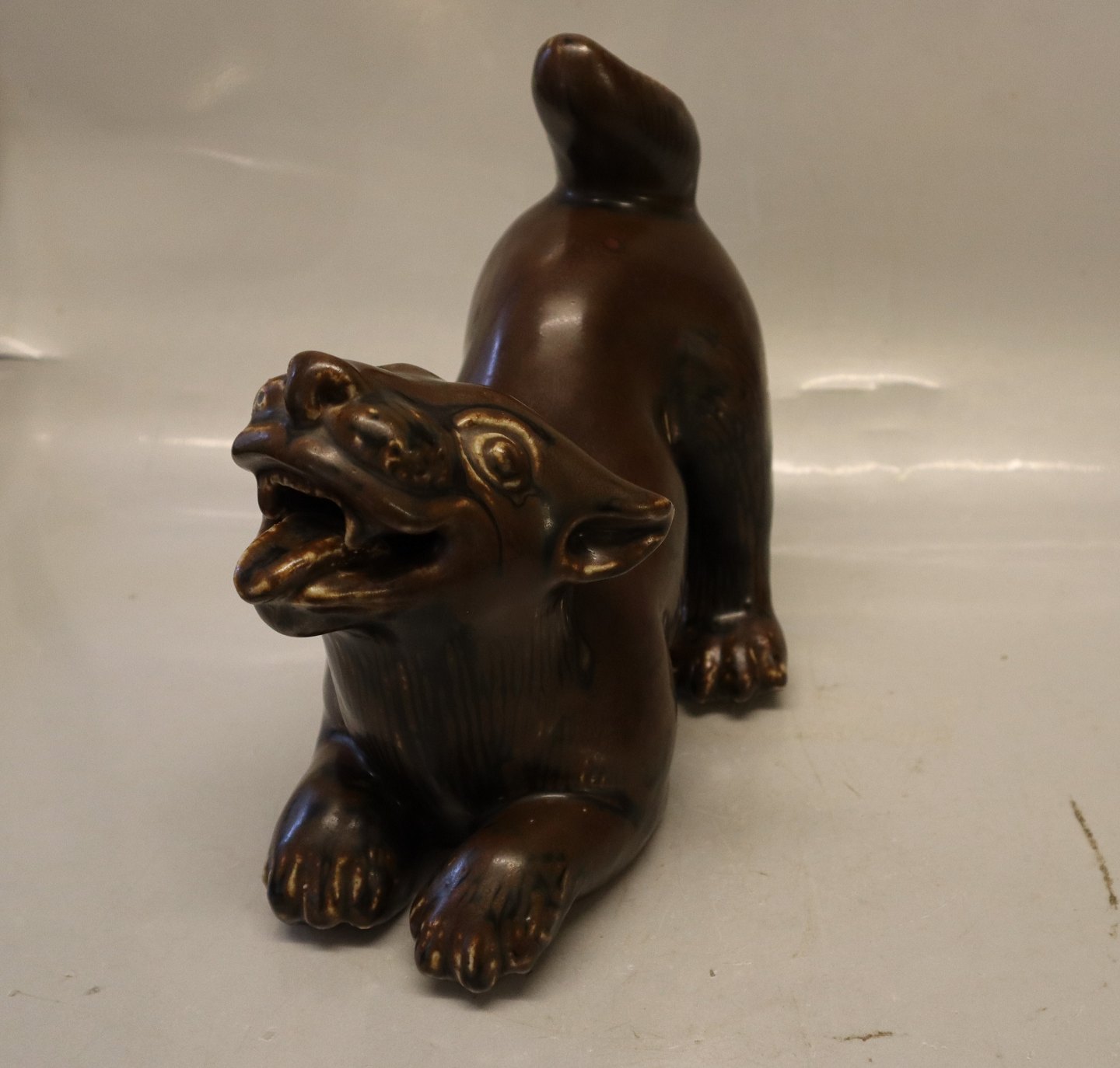 Kongelig Dansk Stentøj Unika Kgl. Stor Vild kat 22 x 25 cm Johannes Hedegaard 1950 Olivin Glasur