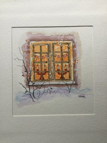 Akvarel af Erik Stuhr - Julelys i vindue