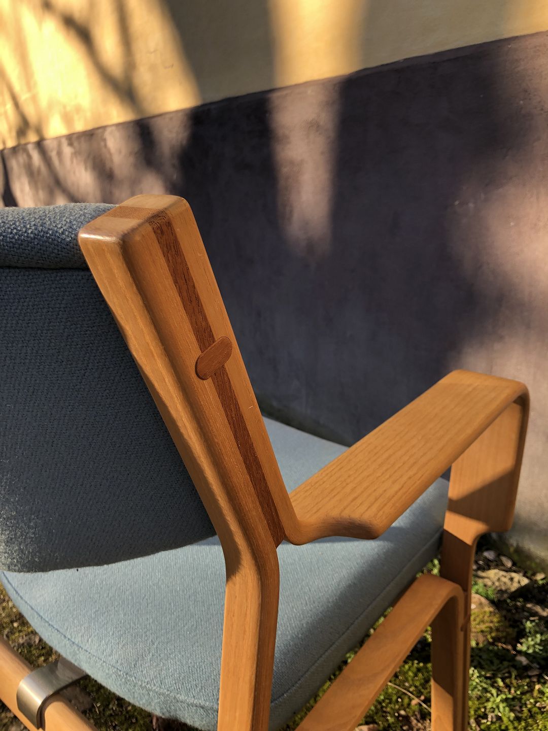 Et par sjældne armstole af Hans J. Wegner model JH742 udført i Ask indlagt med Teak og betrukket med Hallingdal uld.
