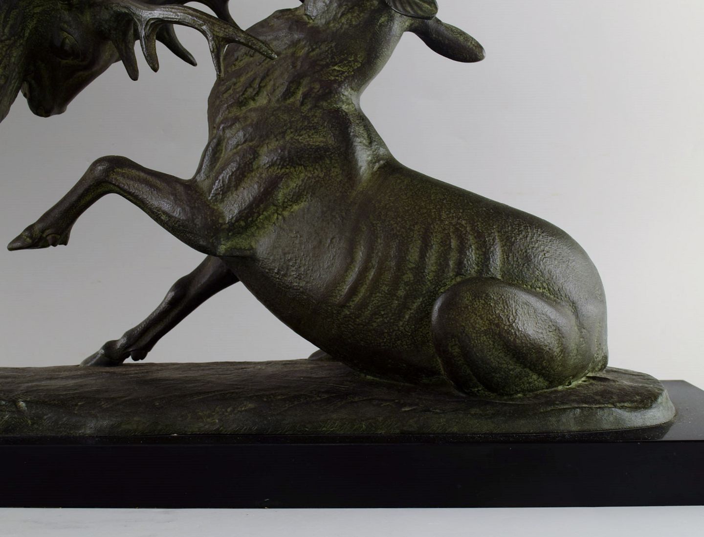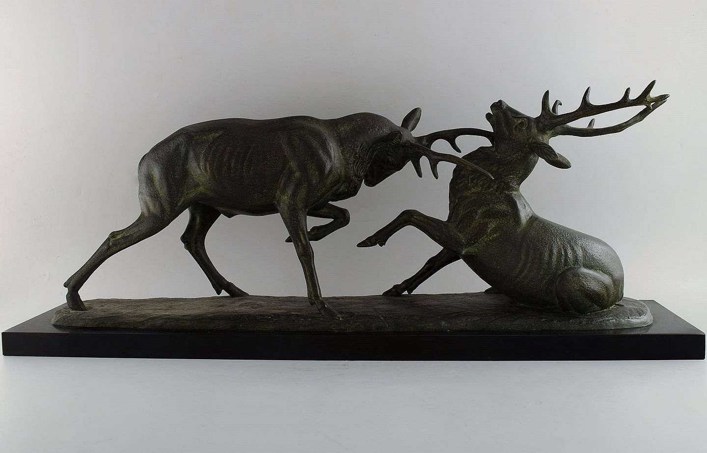 Irénée Rochard (1906-1984), Frankrig. Kolossal skulptur i patineret bronze på marmorbase. Kæmpende kronhjorte. Midt 1900-tallet.
