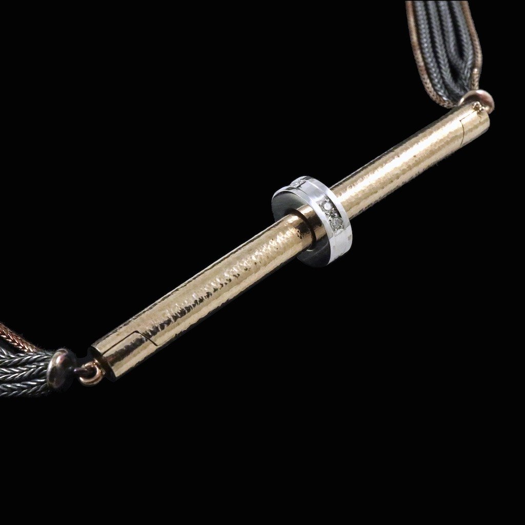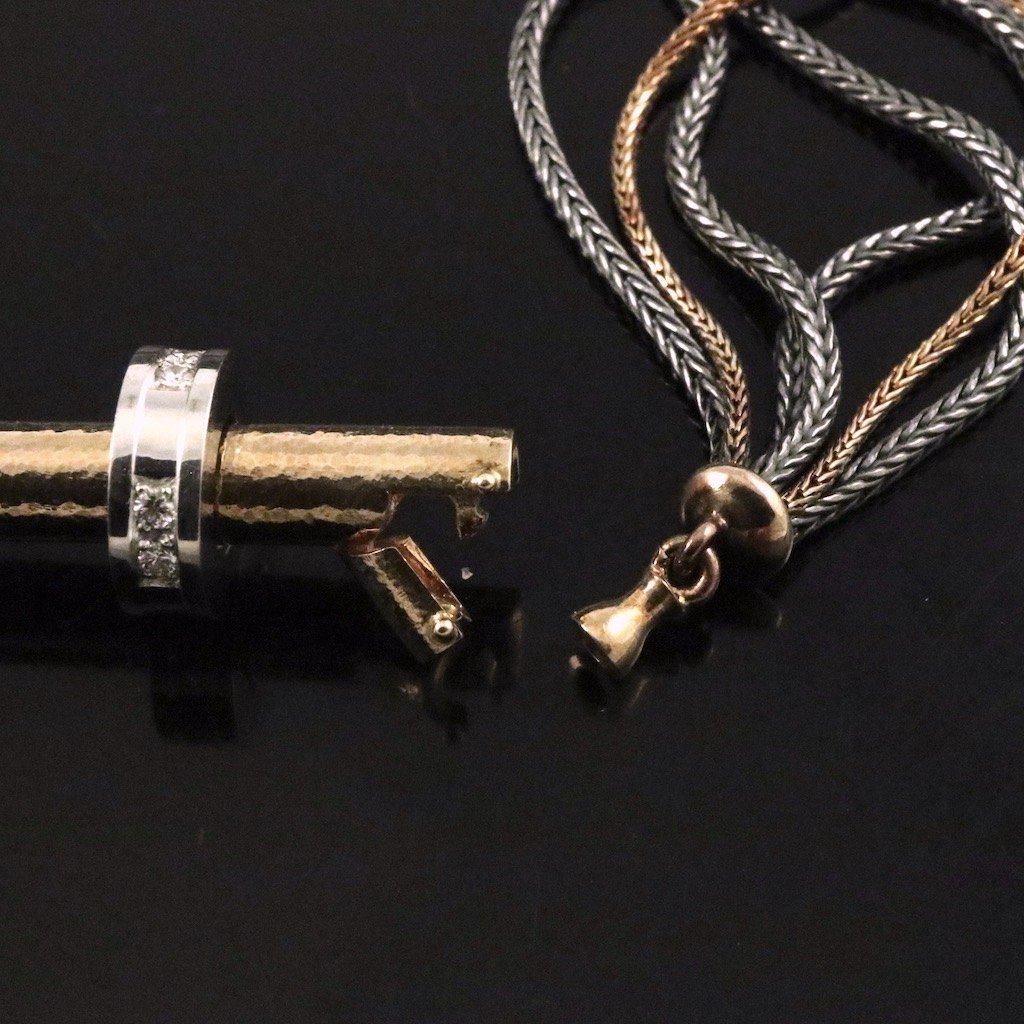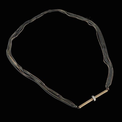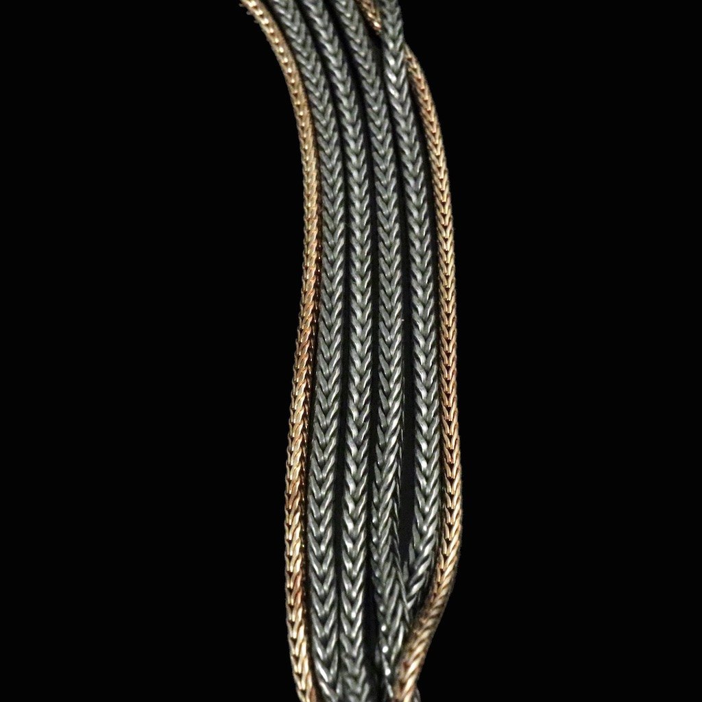 Kæder i oxideret sterling sølv og 14k guld.