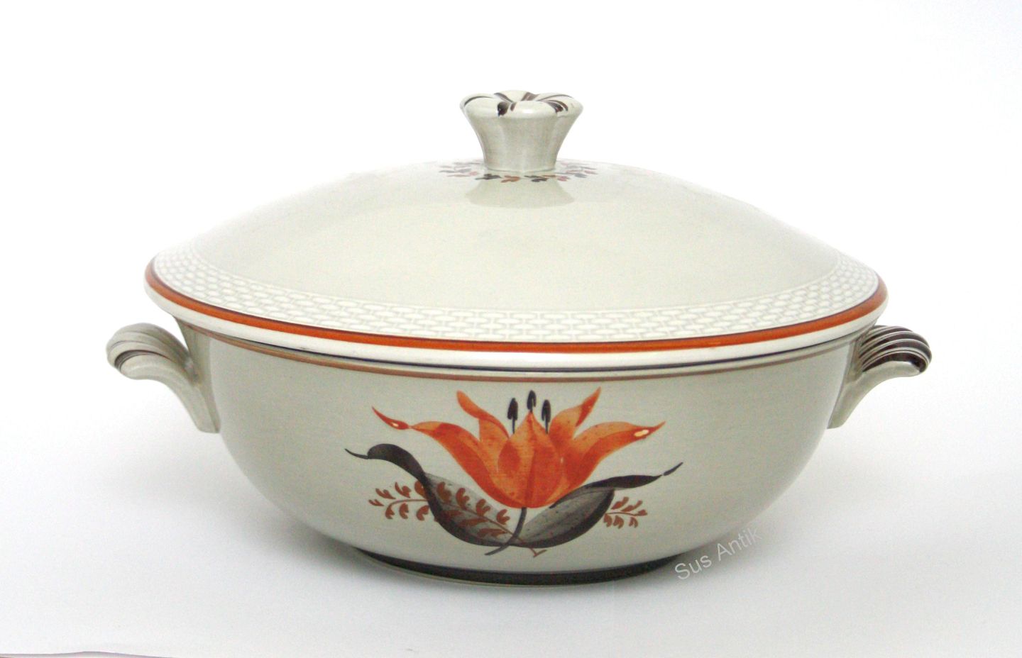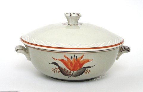 Aluminia, Kirsten dek.nr. 263. Grå fajance med brune kanter og 3 forskellige håndmalede blomster. Stellet er produceret i perioden 1933-67 og er designet af Nils Thorsson. Terrin med låg. Højde 14 cm. Diameter 22 cm. Flot stand. Pris: 375 kr.