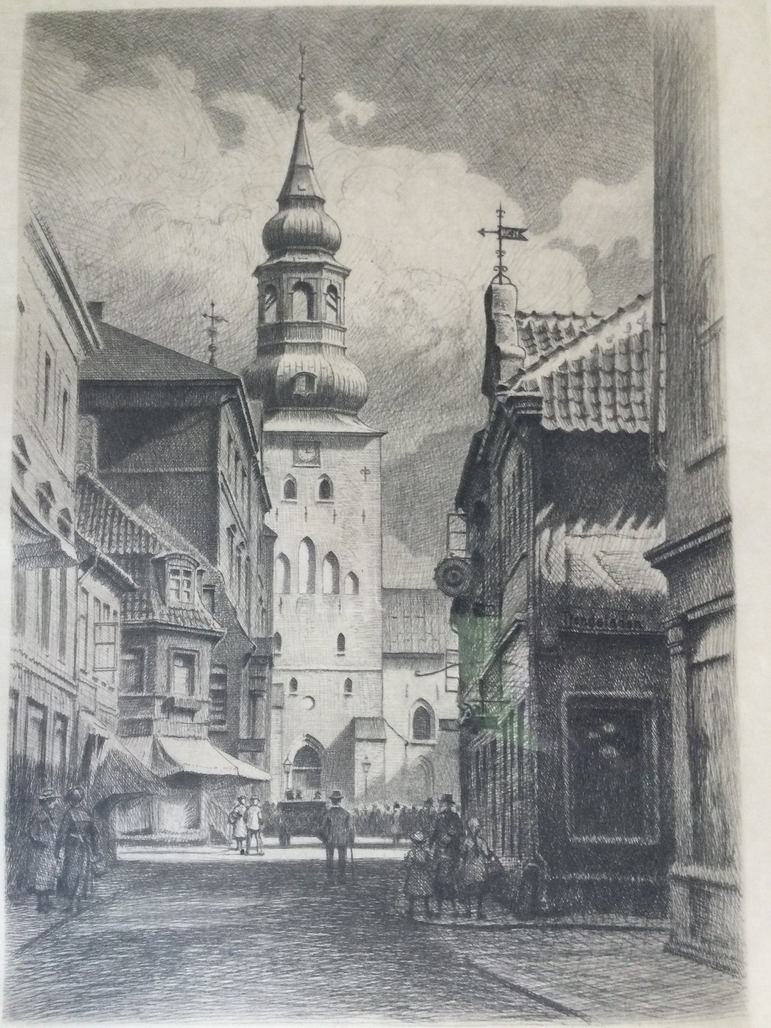 Radering af Peter Tom-Petersen - Algade, Aalborg med Budolfi Kirke 1920.