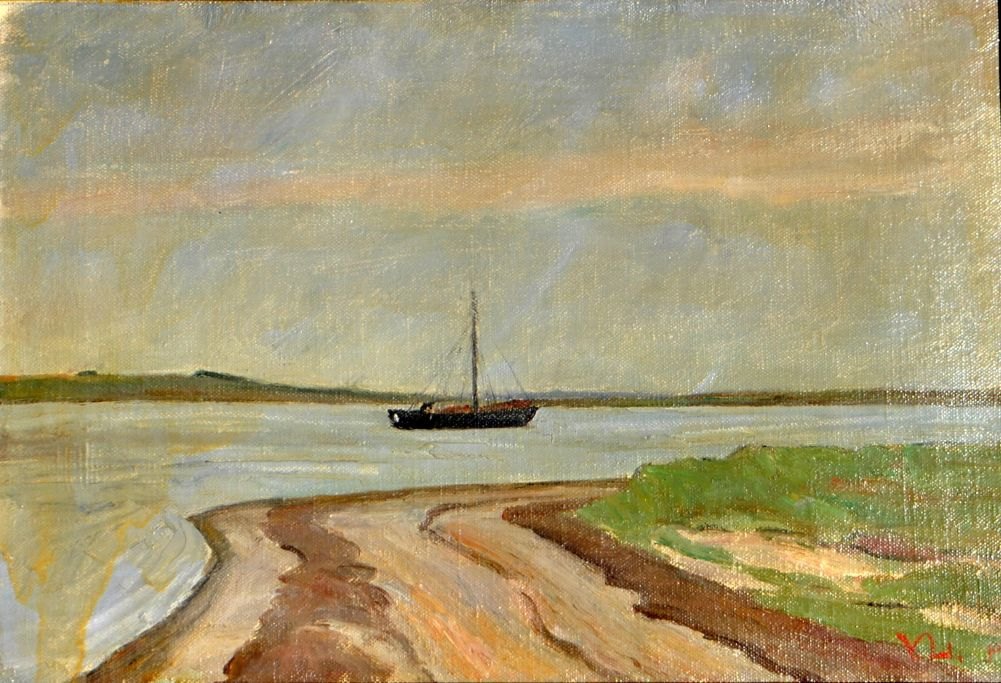 Dansk kunstner (20. årh.): En båd på vandet. Olie på lærred. Signeret: VL 1919. 25 x 38 cm.