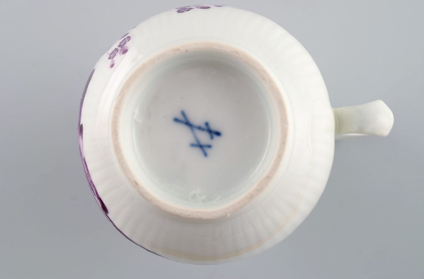 Antik og sjælden Meissen mokkakande i håndmalet porcelæn. Purpur blomster og guldekoration. Tidligt 1800-tallet.