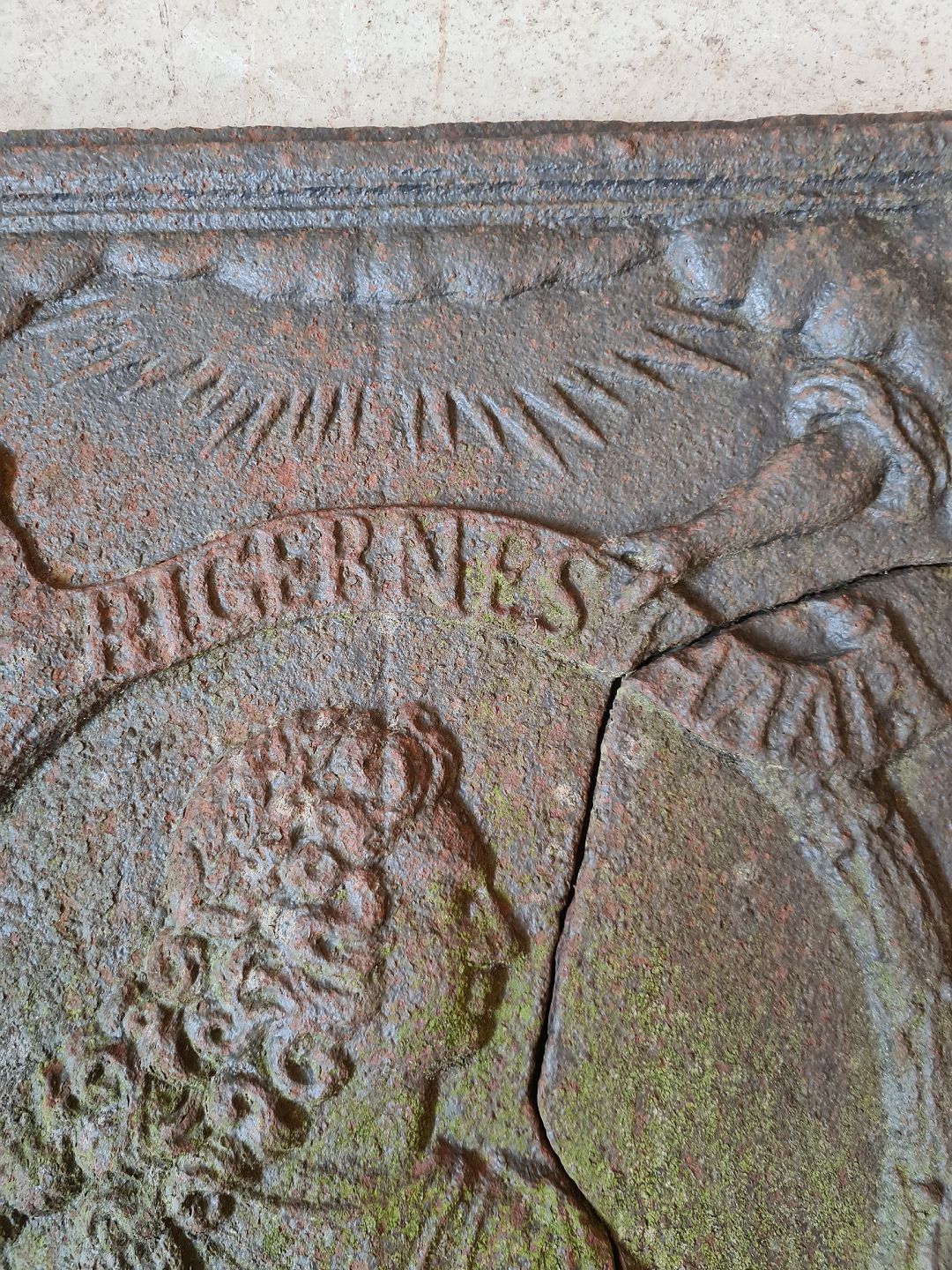 Antikt relief i smedejern, med brugsspor og patina.