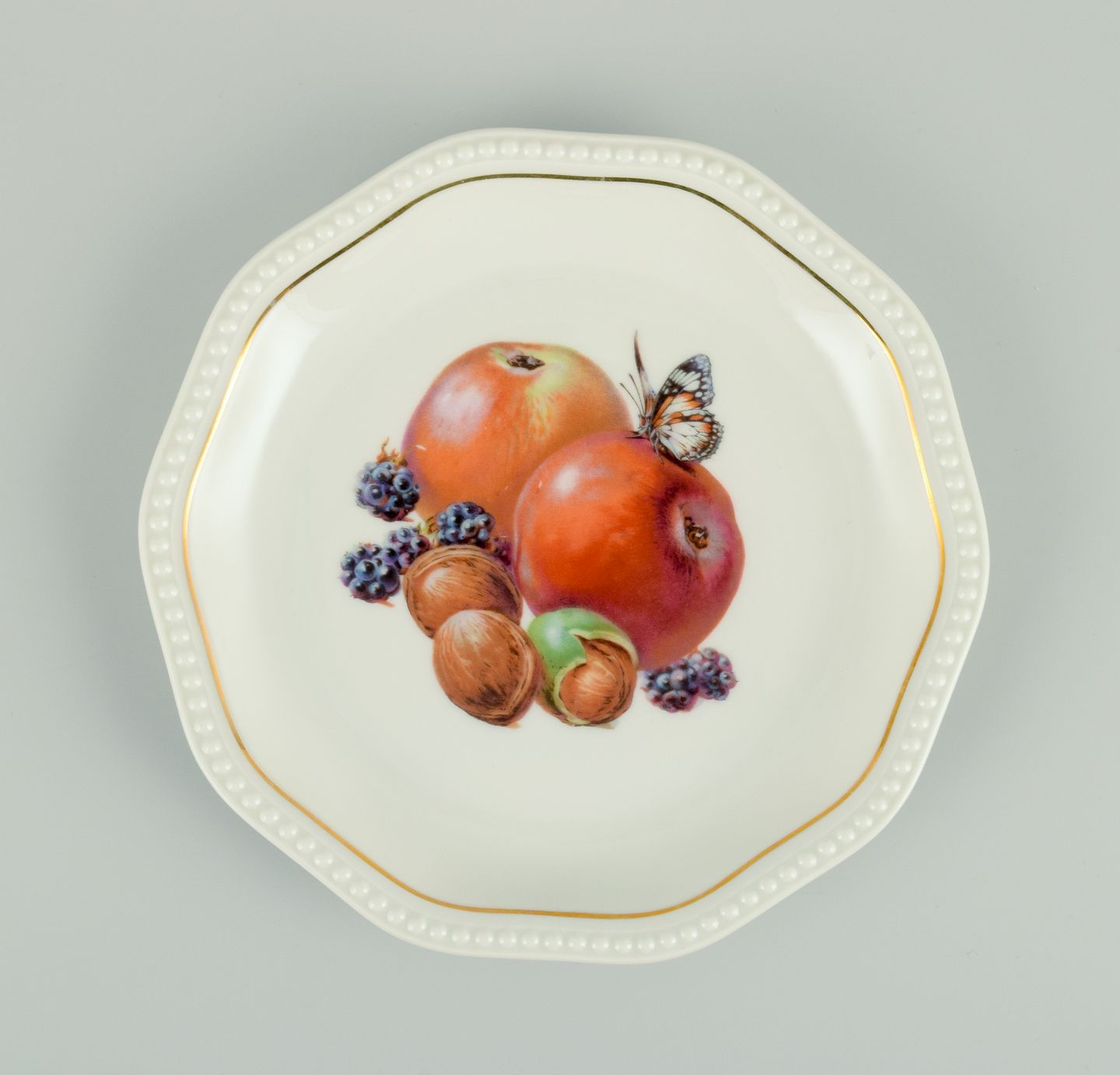Rosenthal, Tyskland, seks tallerkner håndmalet med frugter, sommerfugle og guld-dekoration.