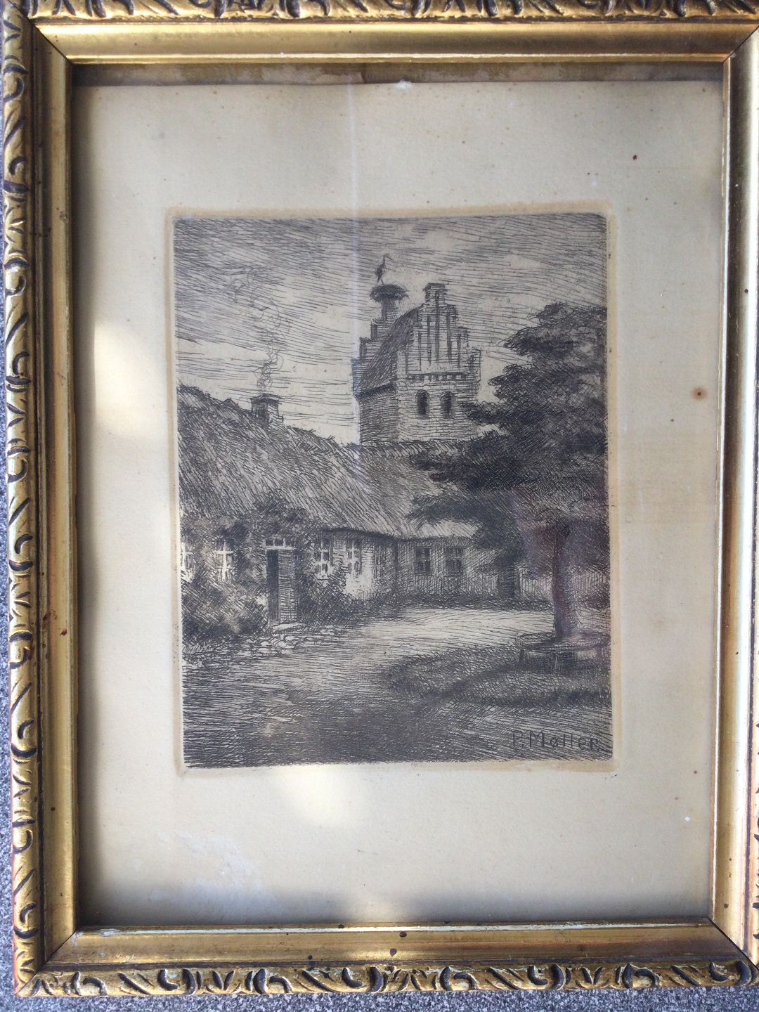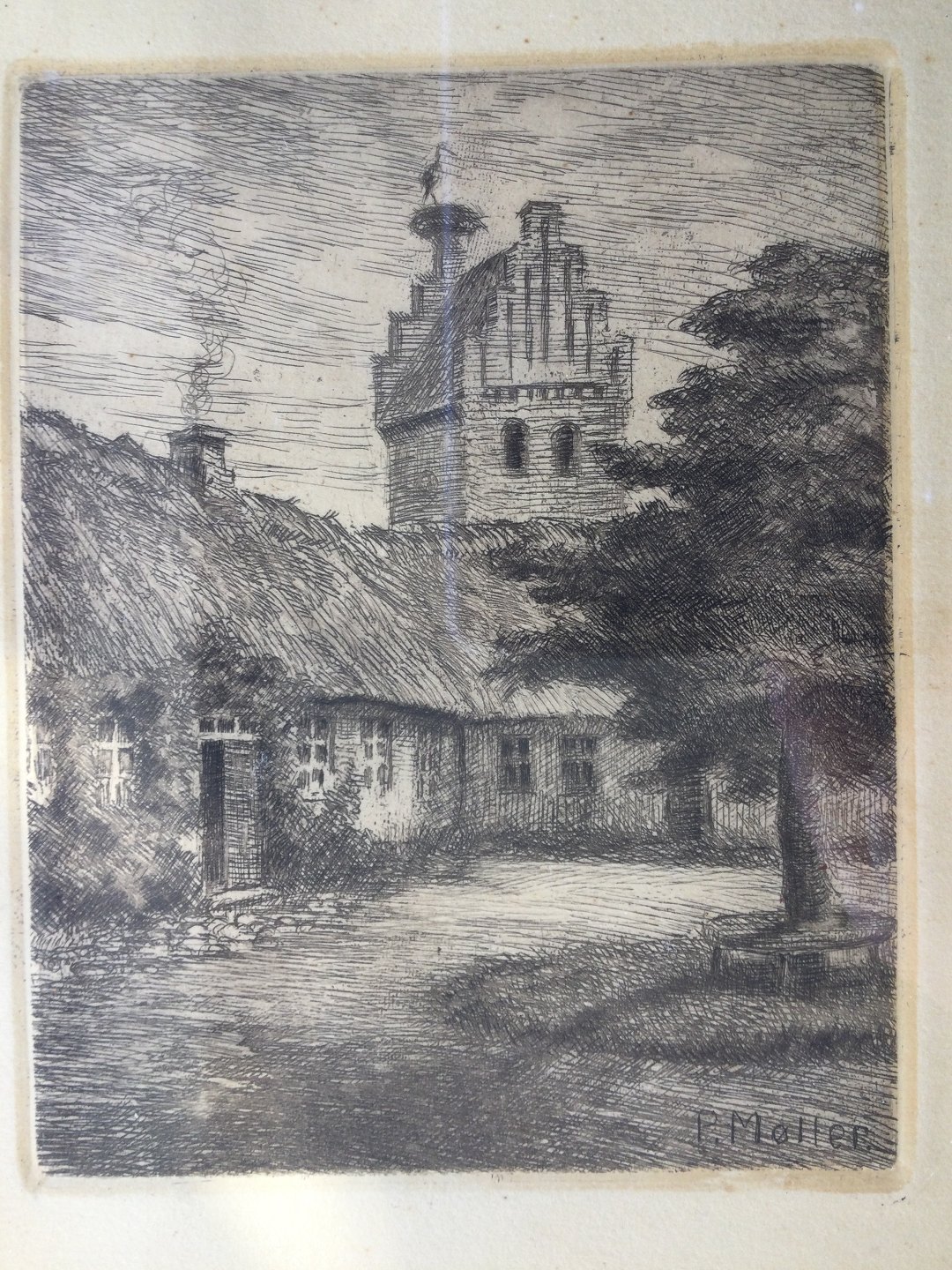 Radering af Peder Møller - Søllerød Kirke med stork på kirketårnet.