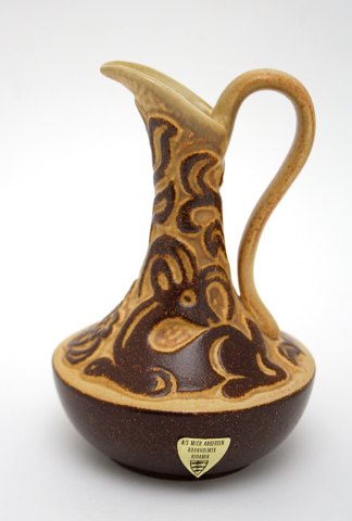 Michael Andersen, Bornholm. Brun stentøjserie fra 1960'erne med forskellige motiver. Kande eller vase med motiv af liggende hjort buk. Højde 15 cm. Nr. 6471. Stemlet i bund. Prik med manglende glasur i den brune bund. Fin stand. Pris: 325 kr.