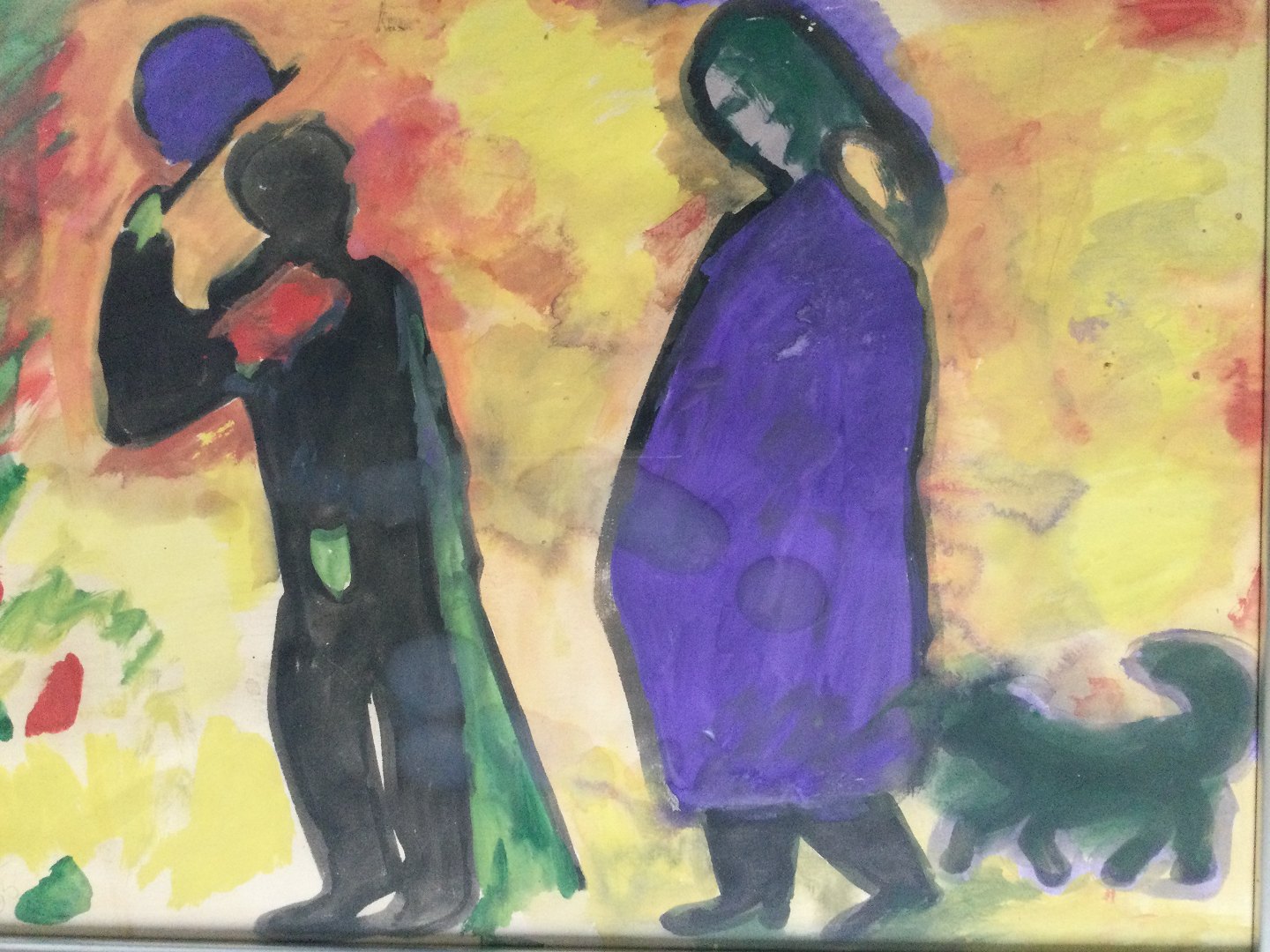 Akvarel 1965 - Mand hilser på gravid kvinde.
