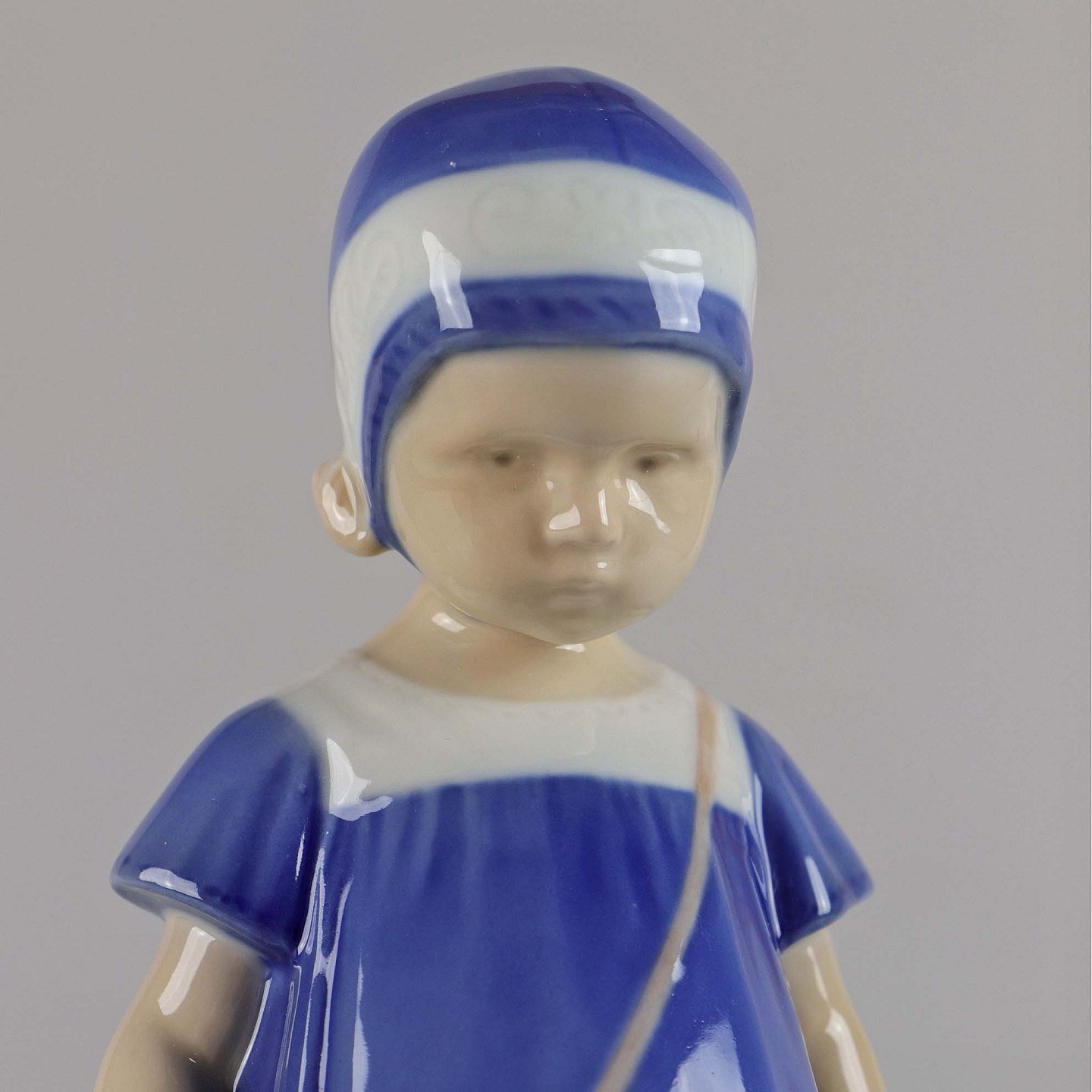 Figur af pige i blå kjole og blå kyse. Over skulderen bærer hun en taske