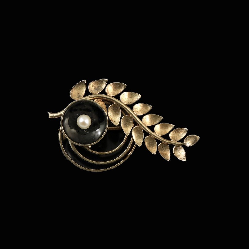 A. Michelsen. Broche i forgyldt sterling sølv med emalje og perle.