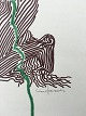 Litografi af Lise Færch - komposition med træ, rødder og menneske.