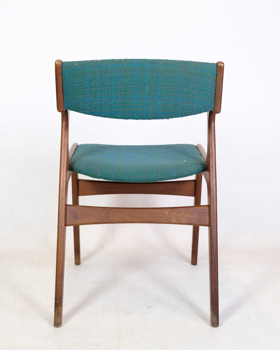 Sæt af fire spisestuestole i teak og lyseblåt stof af dansk design og fremstillet af Nova Møbelfabrik i 1960erne. Stolene er i flot brugt stand.