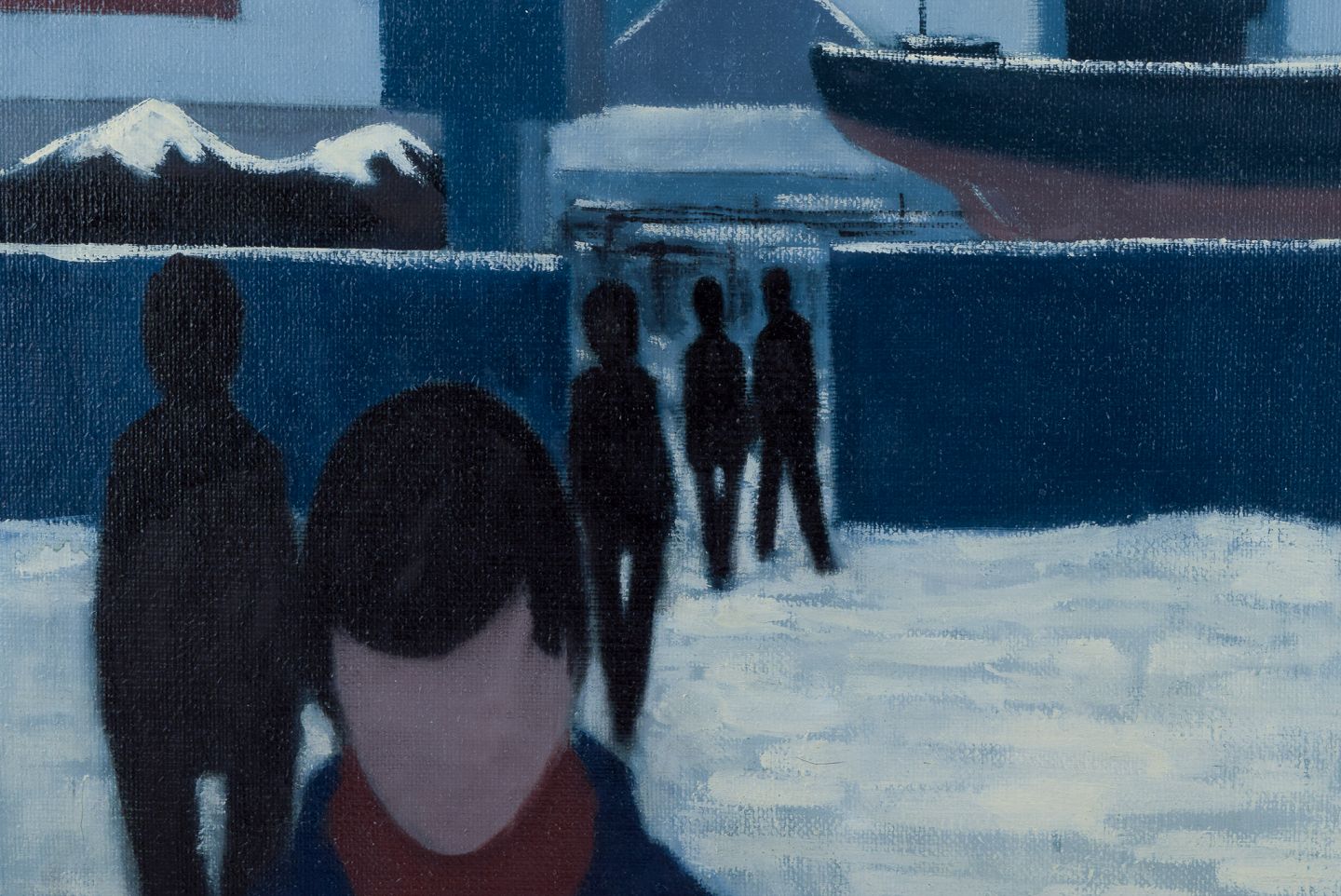 K. Westerberg alias Knud Horup, dansk kunstner, olie på lærred. Modernistisk stil. Havneparti med personer.