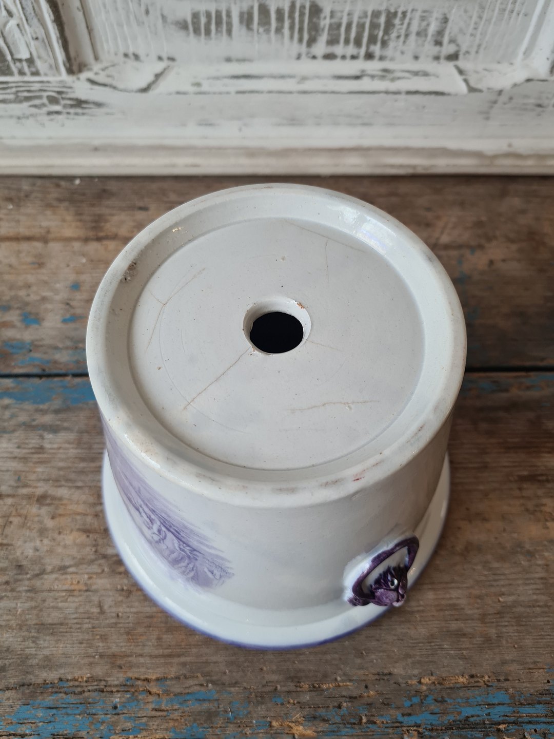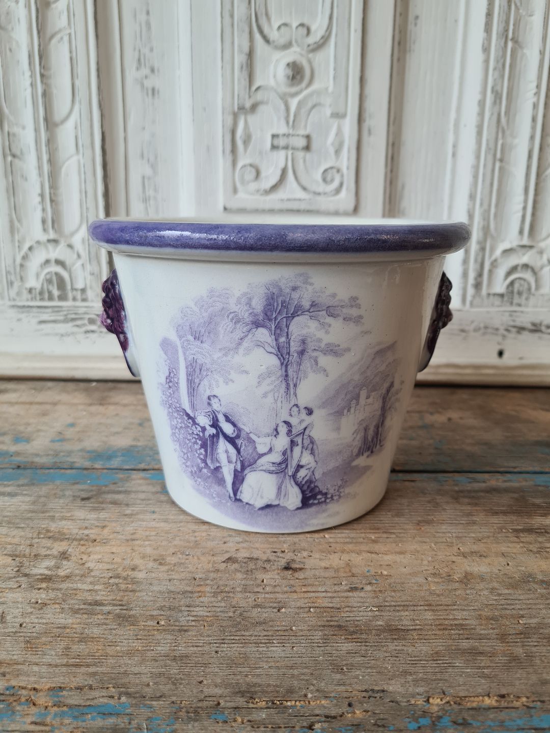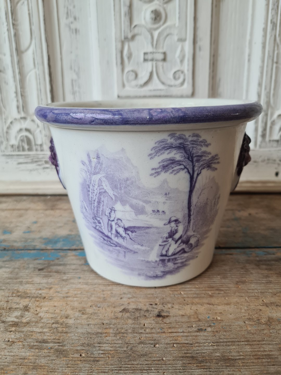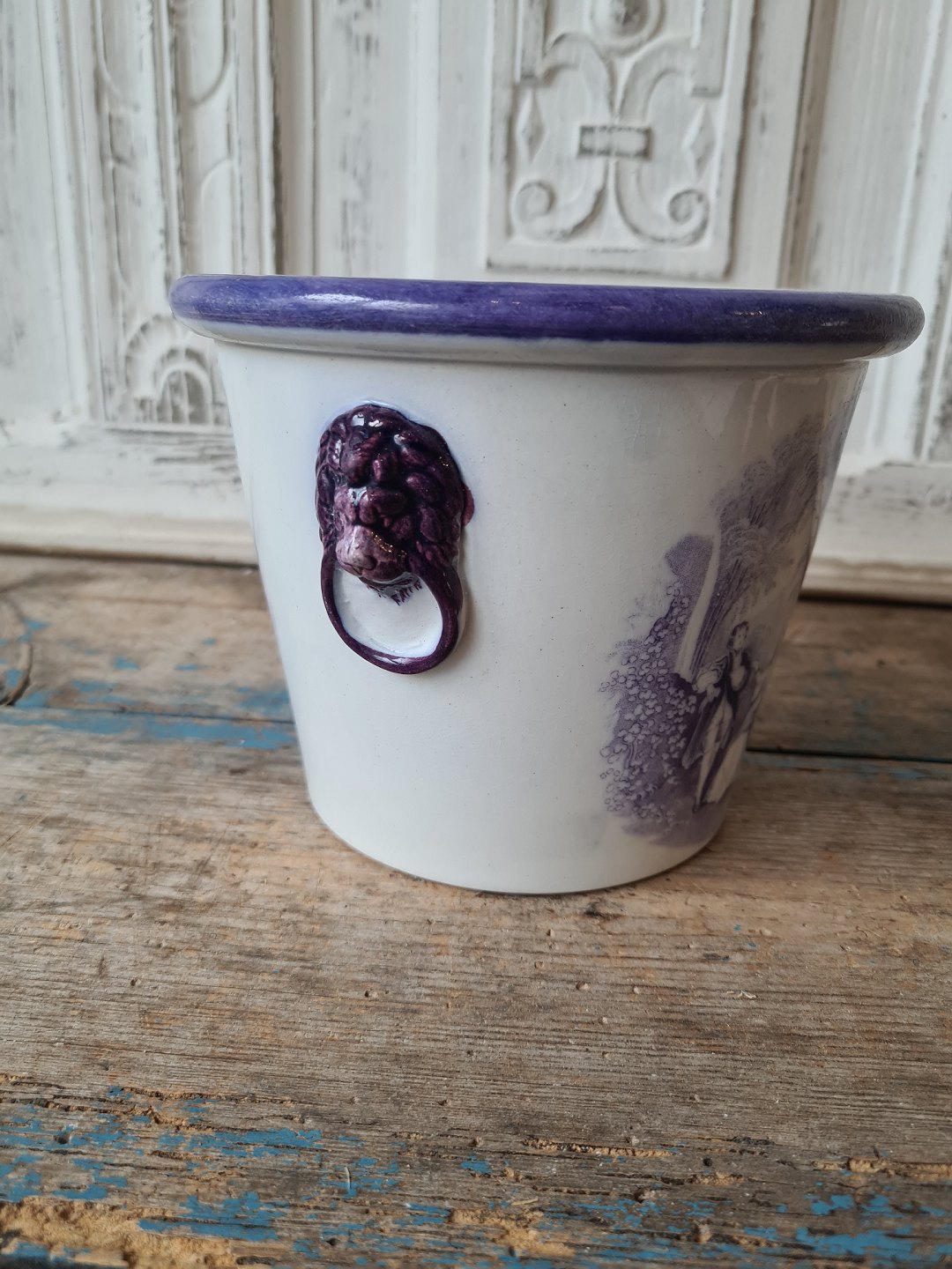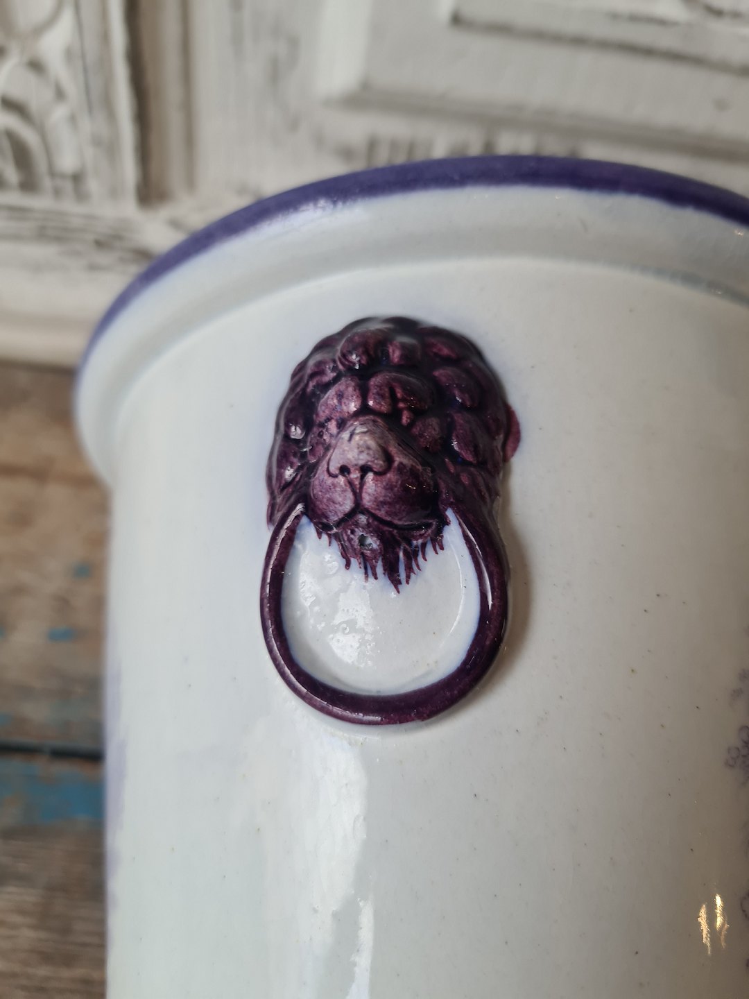 19th century English faience flower pot with lion heads as handle and manganese colored decoration