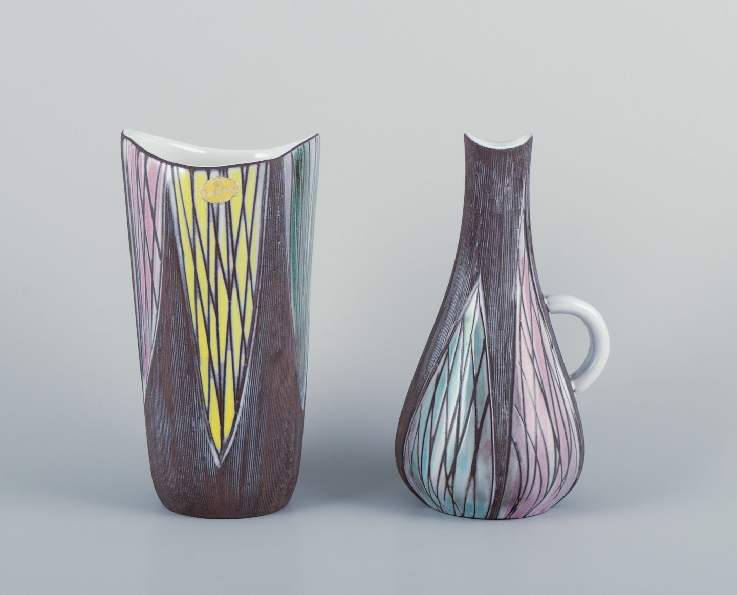 Mari Simmulson for Upsala Ekeby, Sverige. Keramikvase og kande i modernistisk stil med abstrakte motiver.