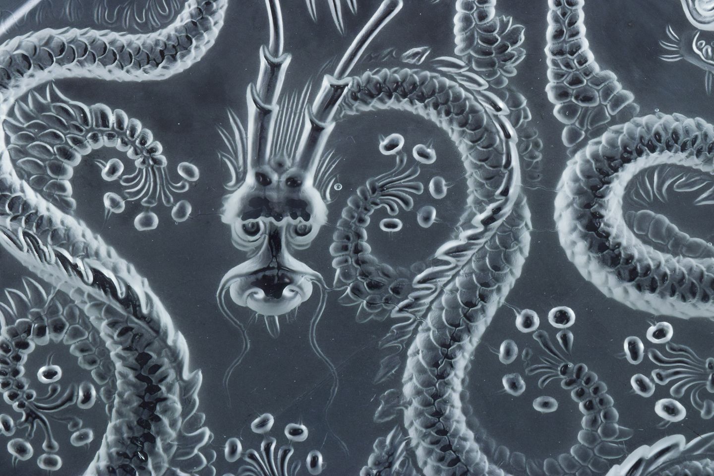 Josef Inwald, kolossal Art Deco kunstglasskål i Barolac glas, designet med drager i orientalsk stil.