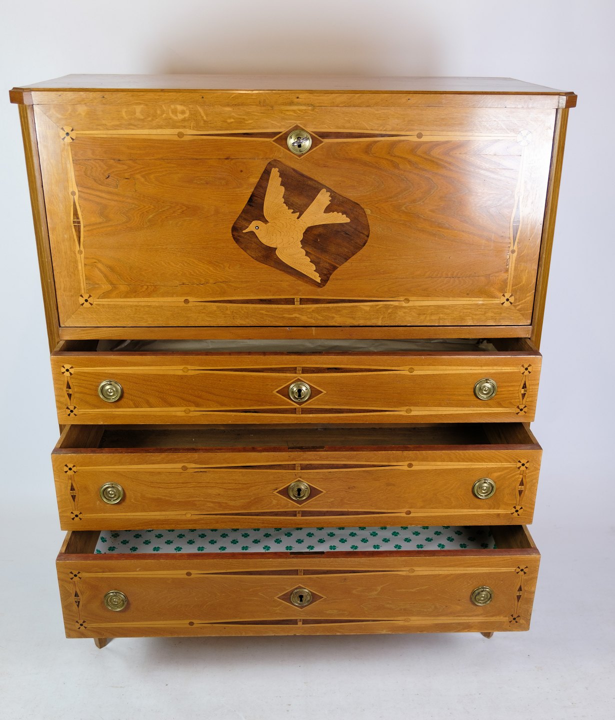 Sekretær af lyst mahogni udsmykket med dekorationer af Intarsia af frugt træ og messing håndtag fra omkring 1810'erne.