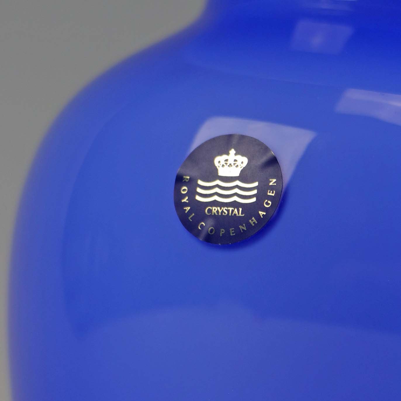 Amfora vase i opal blå glas. Vasen er mundblæst ved Holmegaard glasværk og var en gave til de kongelige medarbejdere ved det danske hof. Indgraveret monogram og 6 - VI - 1998