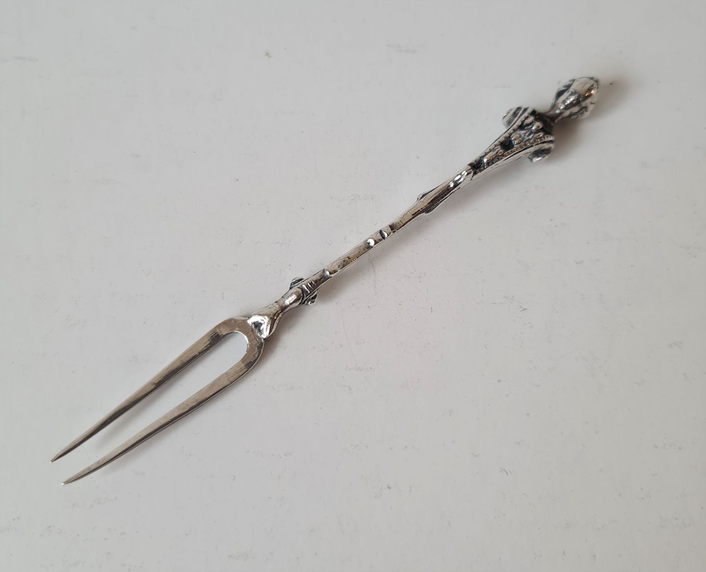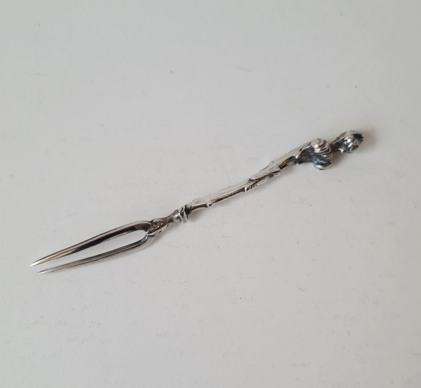 Pålægsgaffel i sølv med skaft udformet som galionsfigur