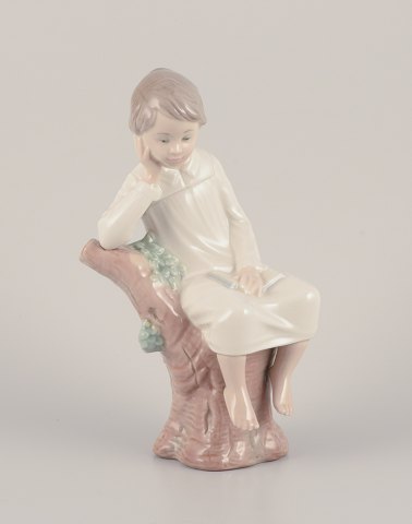 Lladro, Spanien. Porcelænsfigur af pige siddende på træstub.