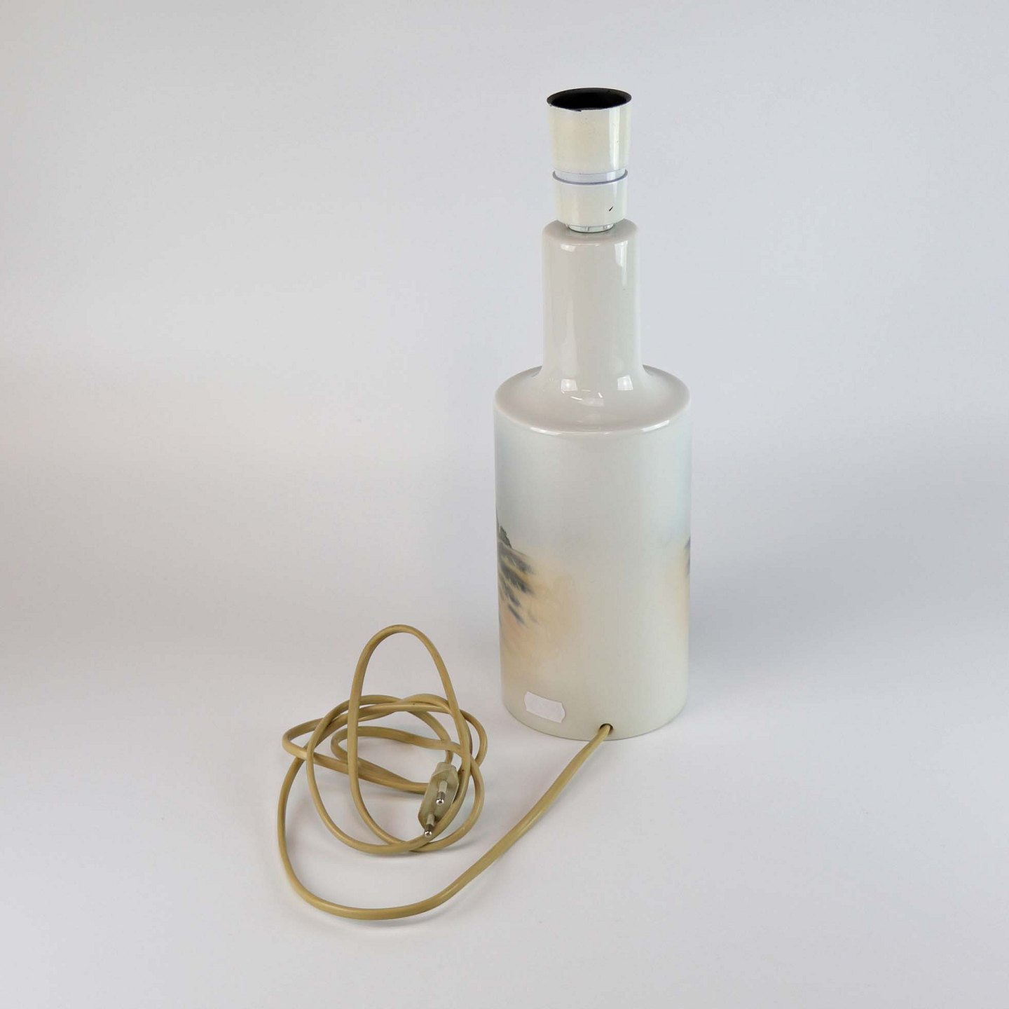 Bordlampe i lyst porcelæn med motiv af stråtækt hus og landskab