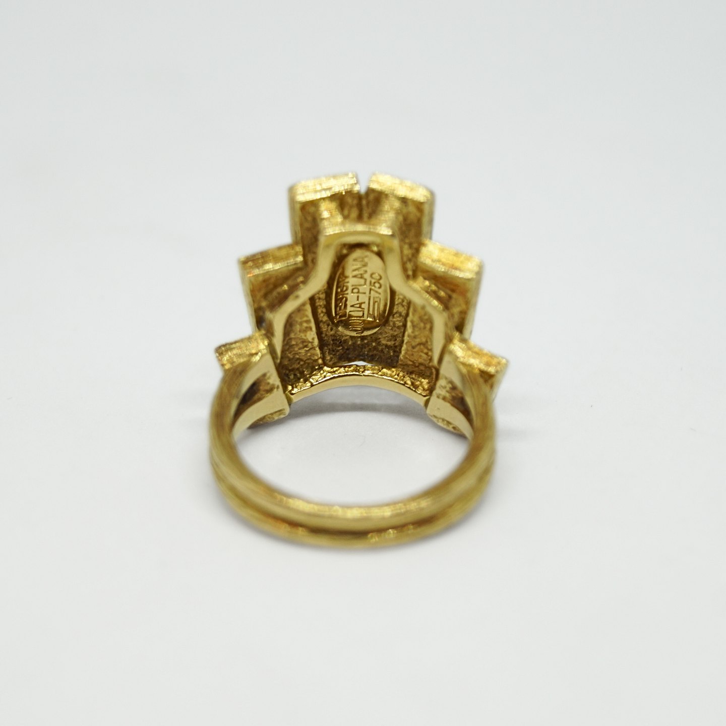 Julia Plana; Ring i 18 kt. guld, prydet med tre hvide koraller og tre Lapis Lazuli. Ring str. 53.