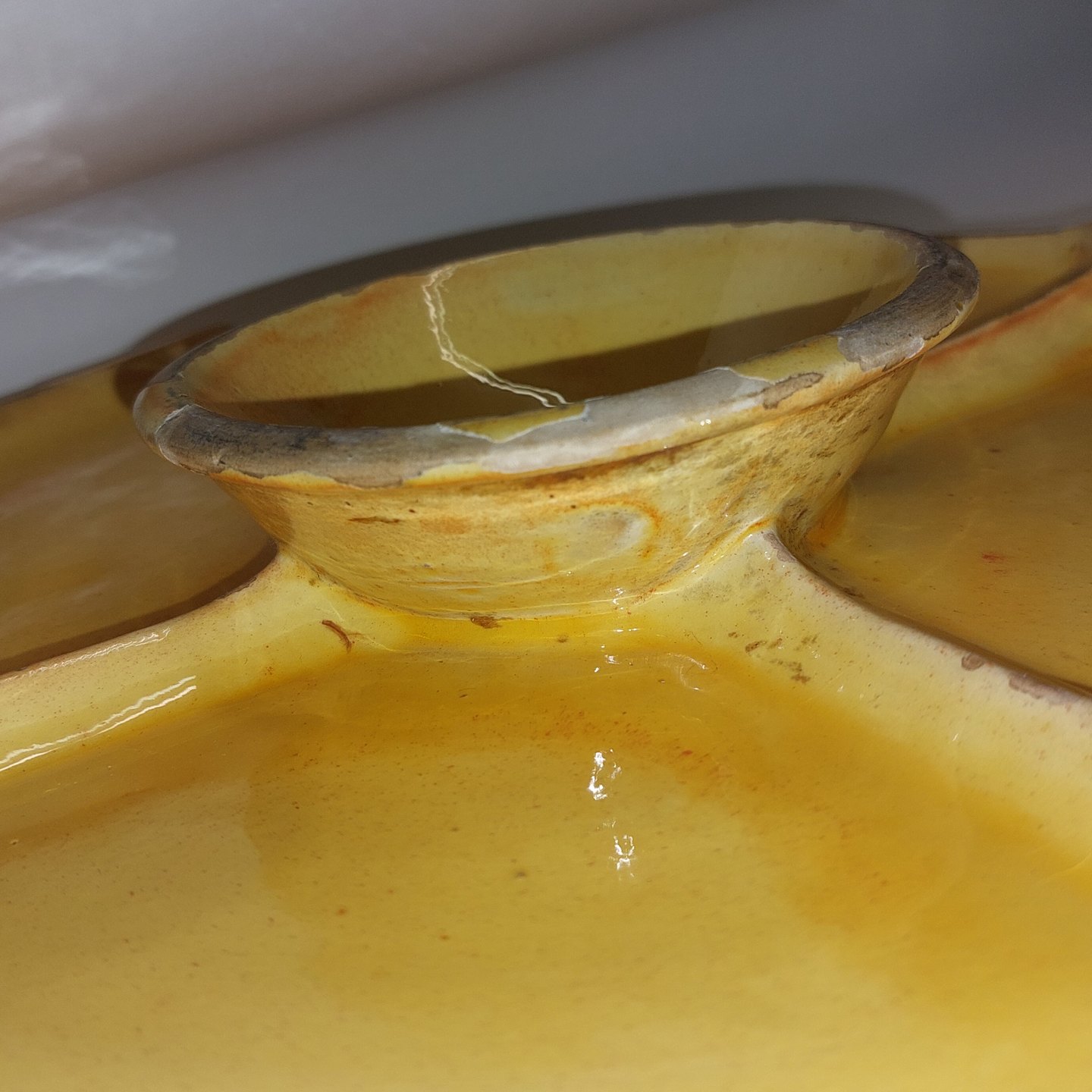 Kähler cabaret fad I keramik dækket af gul glasur..stærke aldersrelateret brugsspor på kanterne. Derud over ingen skader eller reparationer. Fabriksmærket på bunden. Formodes fremstillet omkring 1920. mål: H. 4 cm.Ø. 31 cm