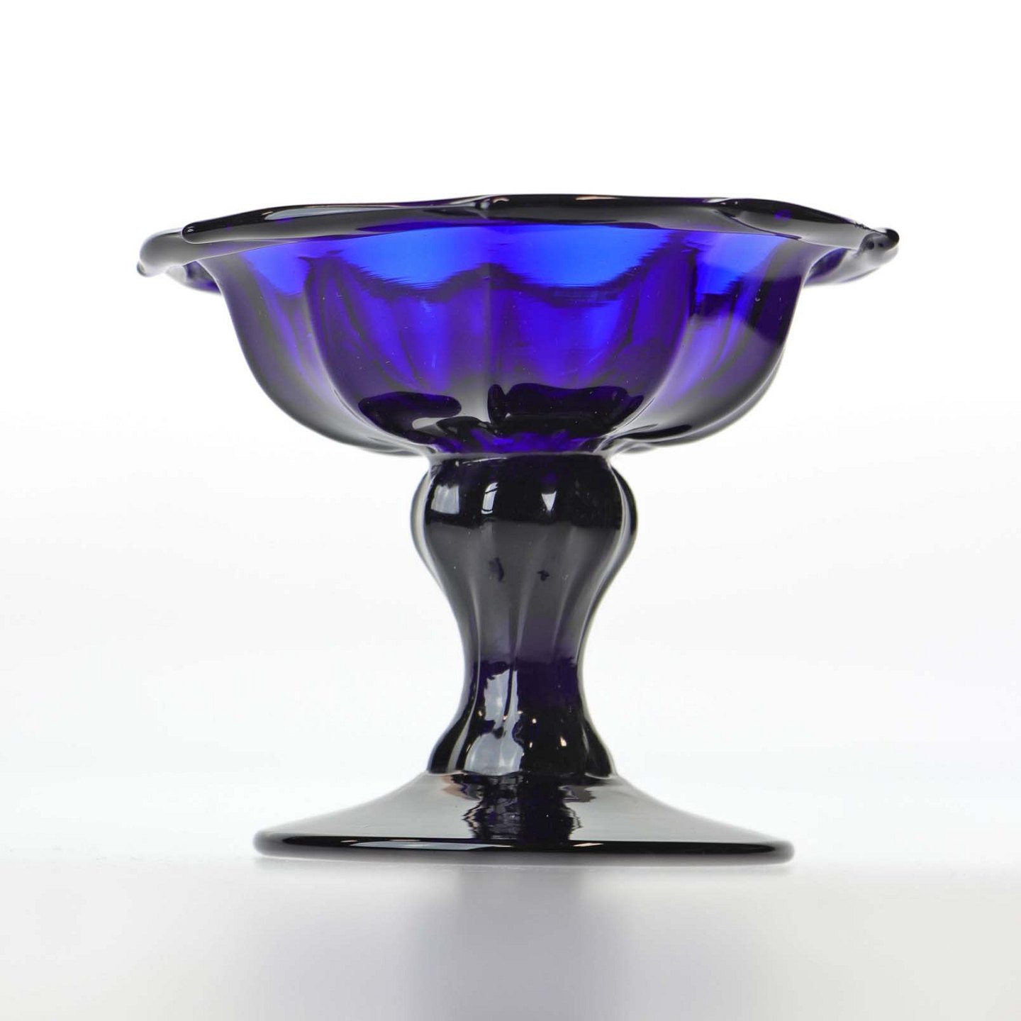 Sukkerskål i blåt glas med optiske striber og kantet form