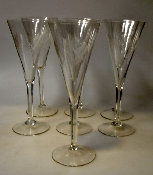 Samling tyske champagne fløjter i krystal med slibninger, ca. 1900. 6 kantet stil. Slibninger på kumme med mønstre. H.: 20 cm.