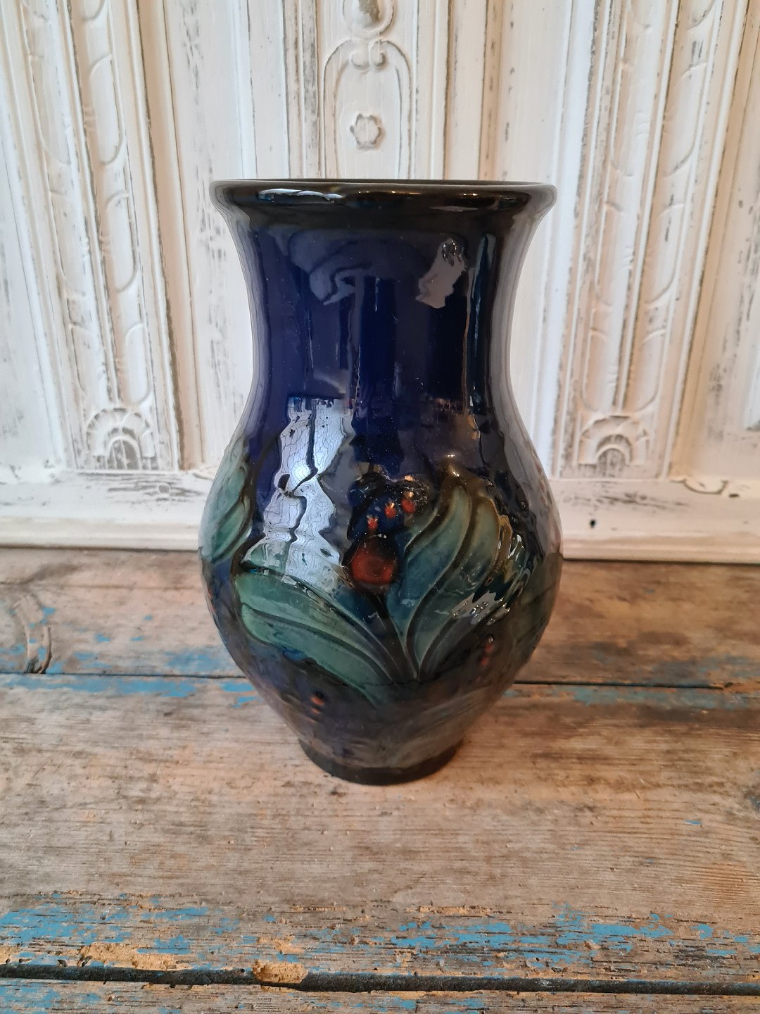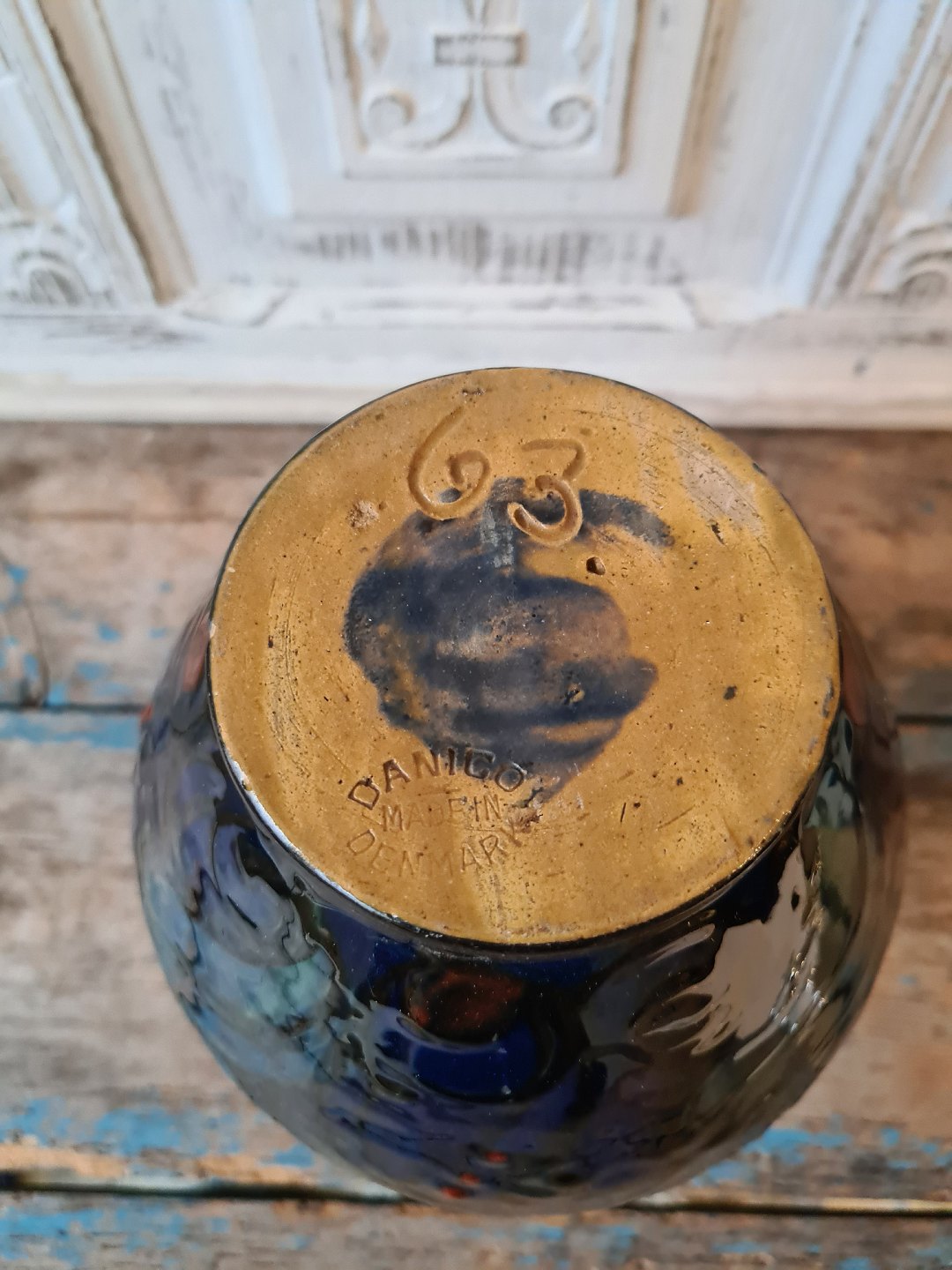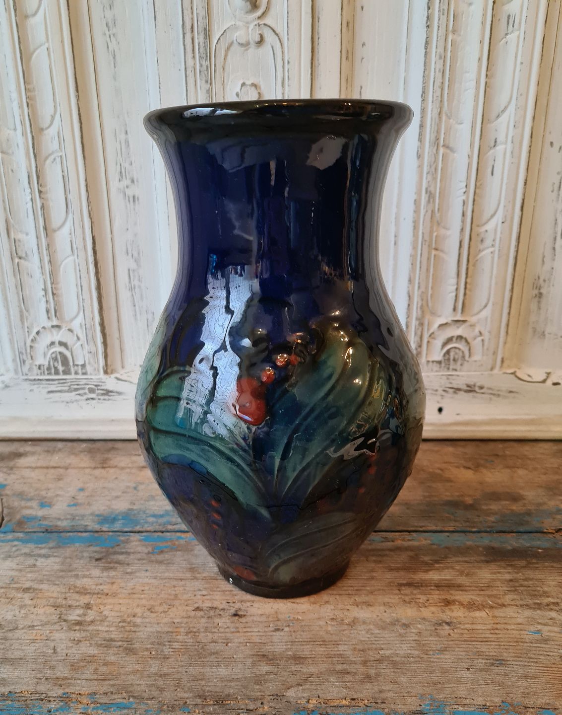 Danico stor midnatsblå vase dekoreret med grønne blade og røde bær