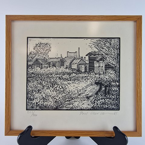 Indrammet træsnit i træramme med motiv af gangvej ledende op til hus med by i baggrunden nr 211/400