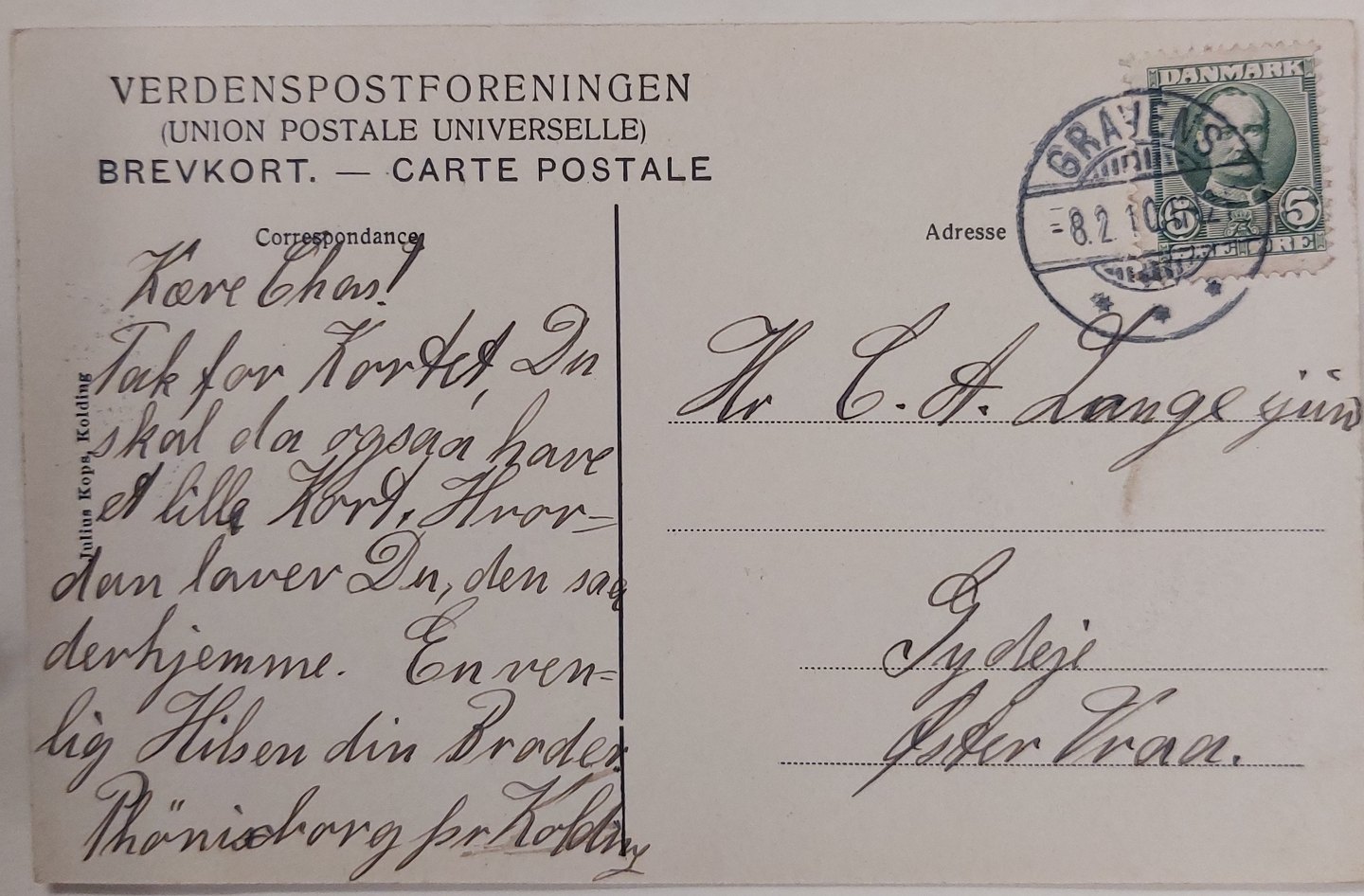 Postkort: Butiksfacade Julius Kops Udstyr -og Galanteriforretning I Kolding. Annulleret GRAVENS I 1910. I god stand
