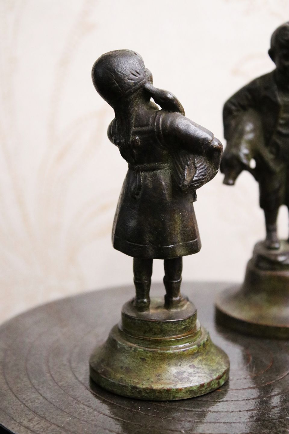 2 små dekorative bronze figurer af dreng med 2 grise under armen og pige der holder en gås. H: 12,5cm. & 11,5cm.