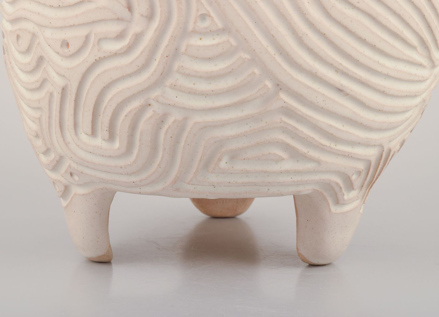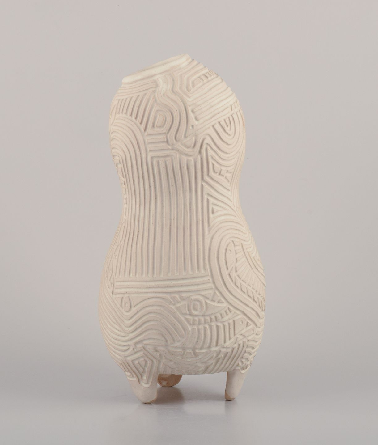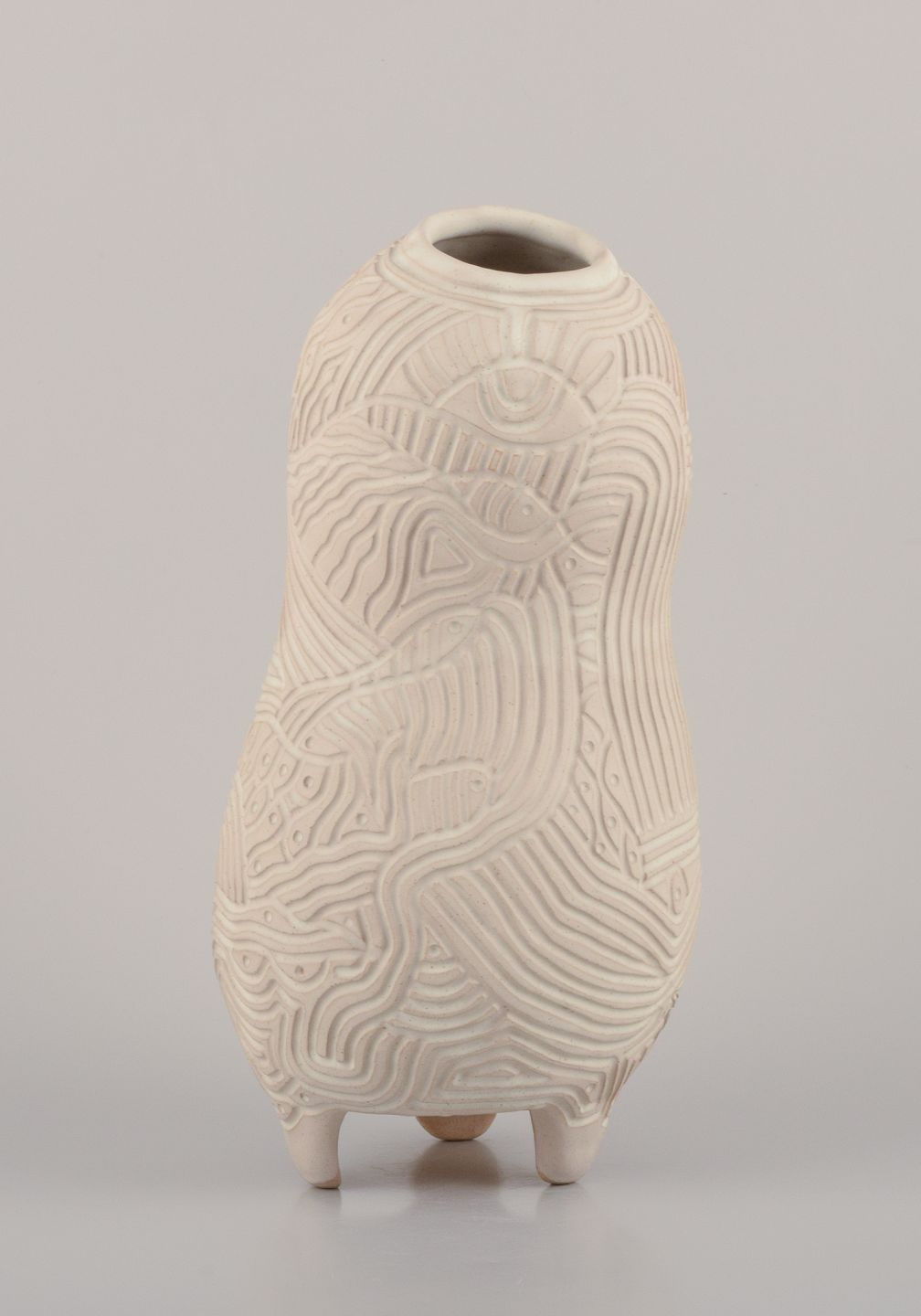 Cremehvid organisk vase på tre fødder. Organisk udformet med symbolsk ridset mønster.