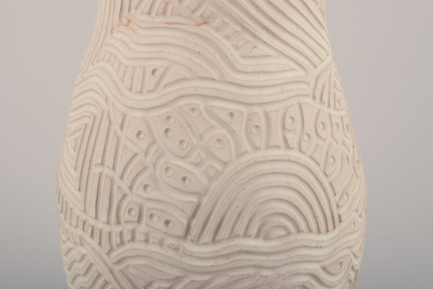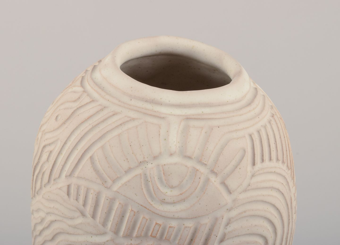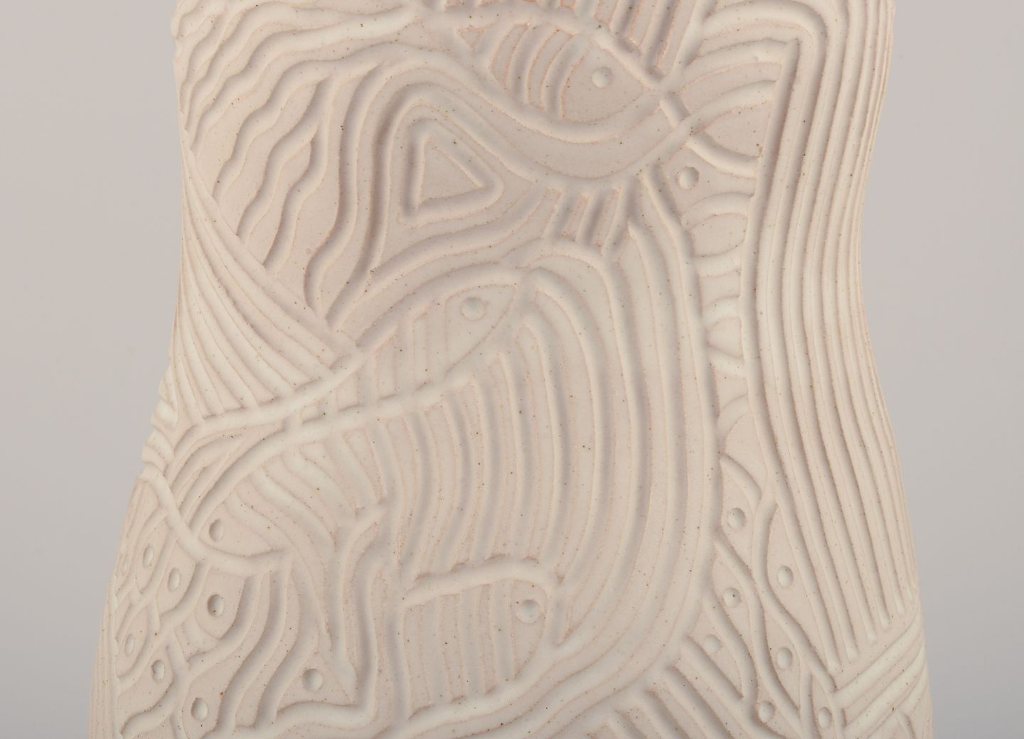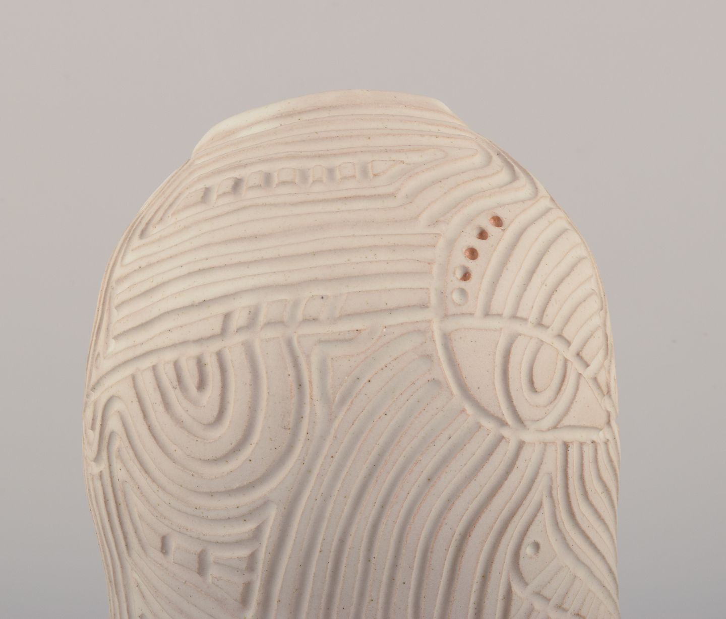 Cremehvid organisk vase på tre fødder. Organisk udformet med symbolsk ridset mønster.
