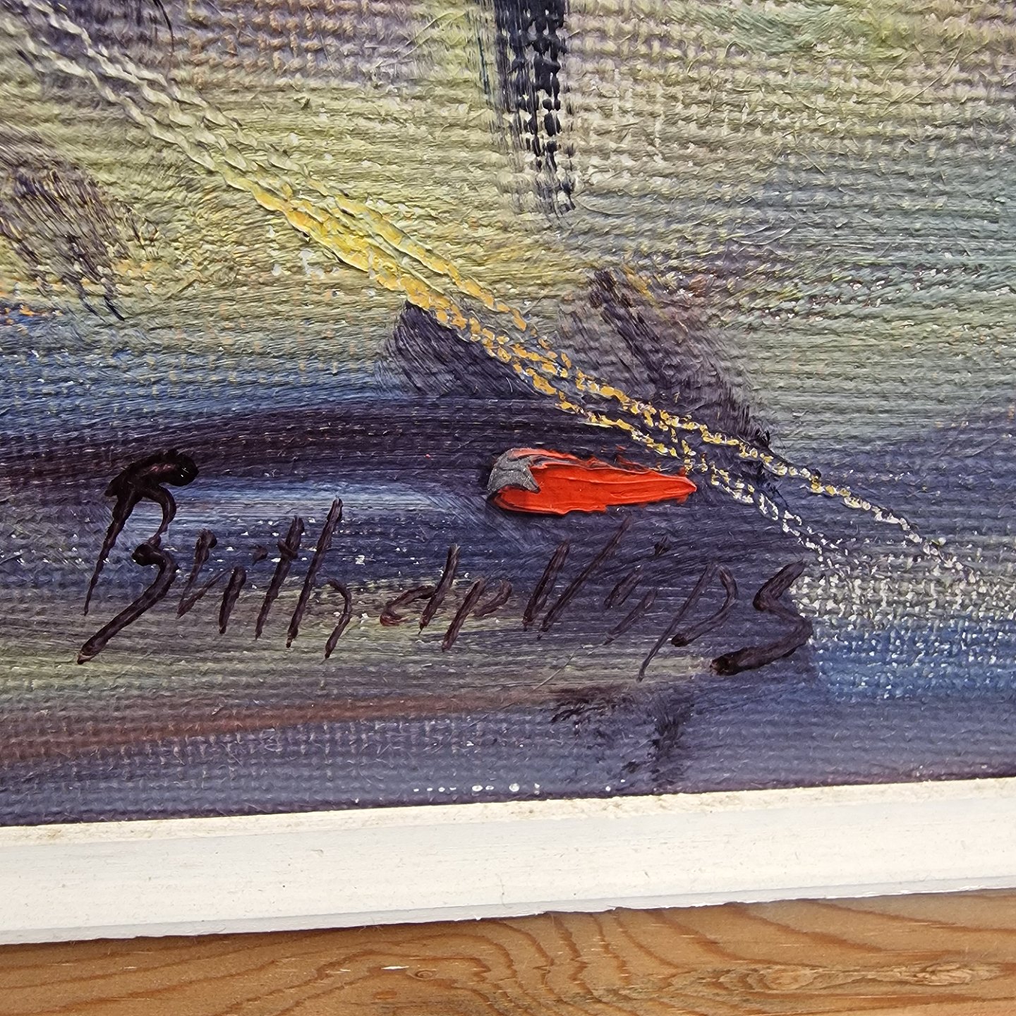 Oliemaling på lærred. Abstrakt maleri med motiv af personer, som går i mod solen