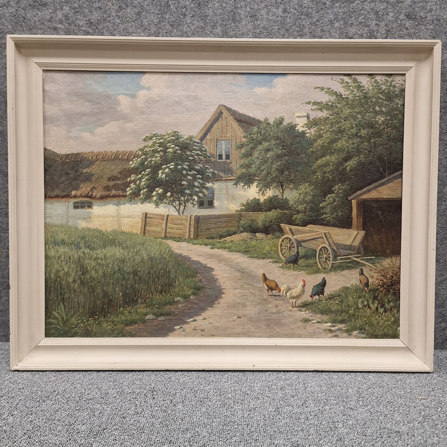 Oliealeri på lærred med idyllisk naturmotiv af høns ved stråtrægt bondegård