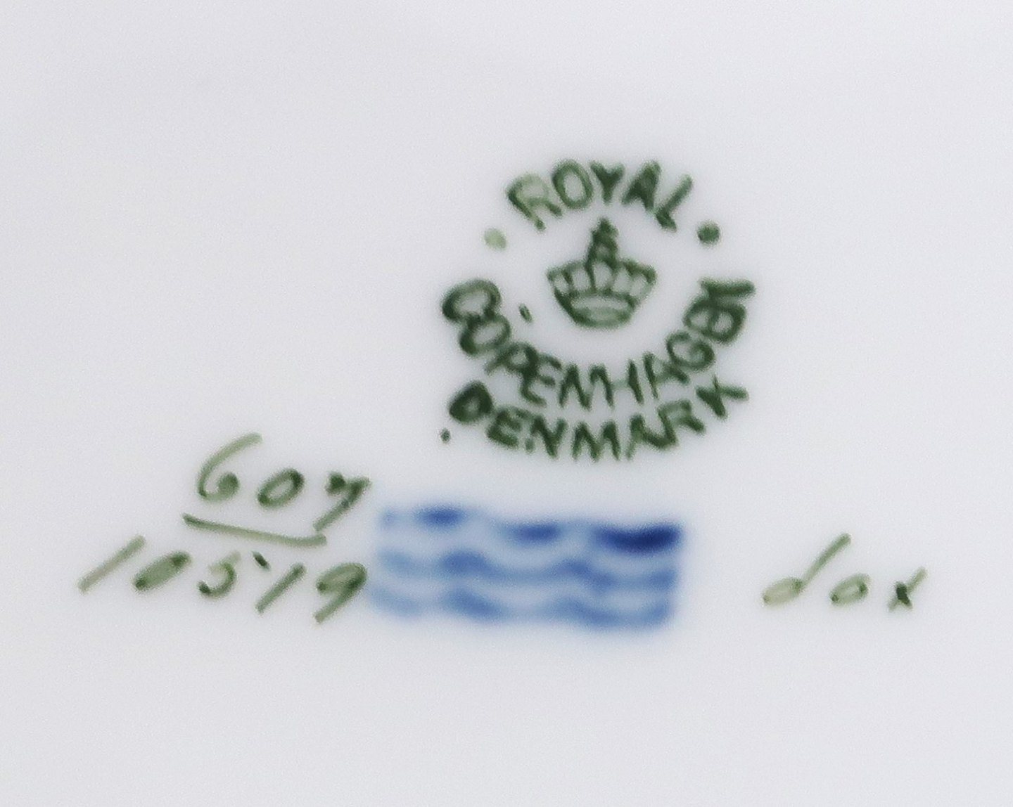 Royal Copenhagen. Porcelænsstel no. 607. Der er til 12 personer. Bestående af 12 middagstallerkner, 12 frokosttallerkner, 12 brødtallerkner, 12 suppetallerkner, 12 bouillonkopper, + se hoved tekst