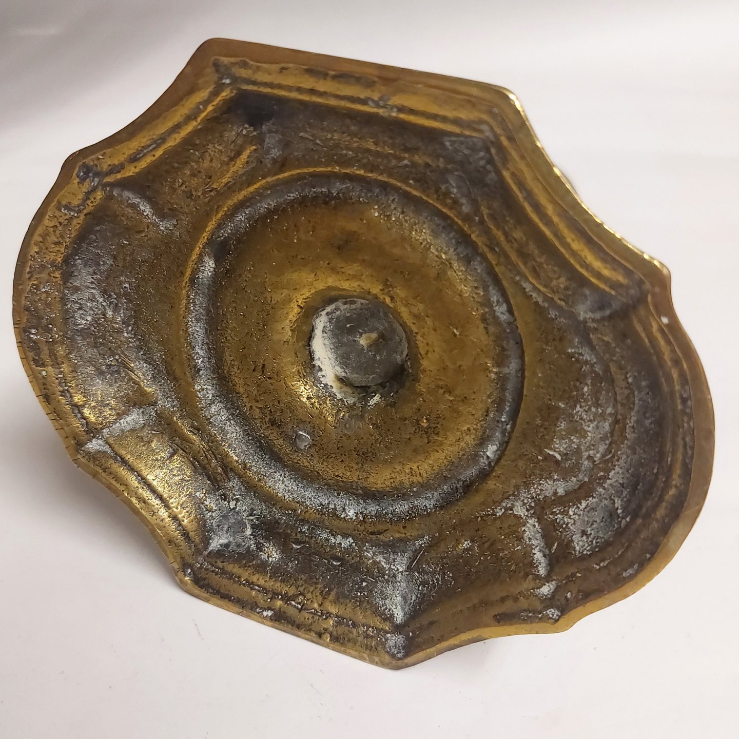 Lysestage I messing fra omkring 1740..I god stand. Lyspiben er dog loddet fast til foden. Penslet dekoration. H. 16 cm Foden måler:.10 x 12 cm.