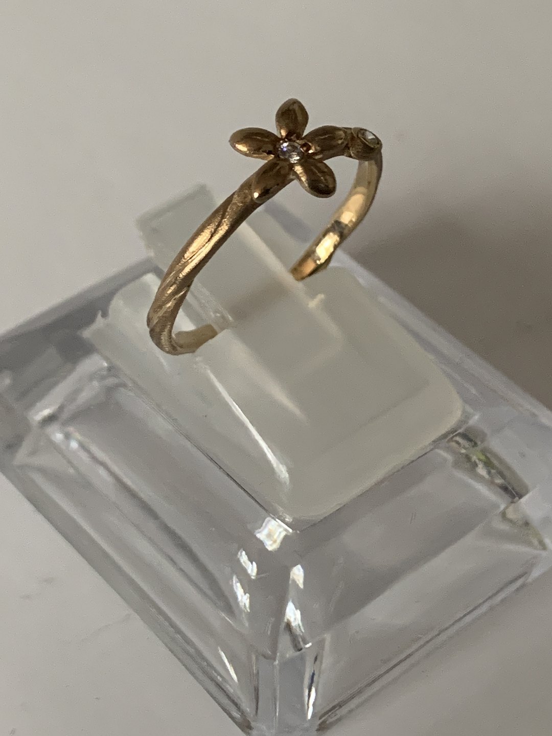 Fin lille guldring 8 karat guld. Blomsten på toppen med den hvide sten, giver et sødt feminint udtryk. Men kombineret med den asymmetrisk placeret hvide sten ved siden af, får ringen sin egen unikke identitet. Dette er en ring der umiddelbart virker simpel, men alligevel har et unikt design, der gør ringen speciel.