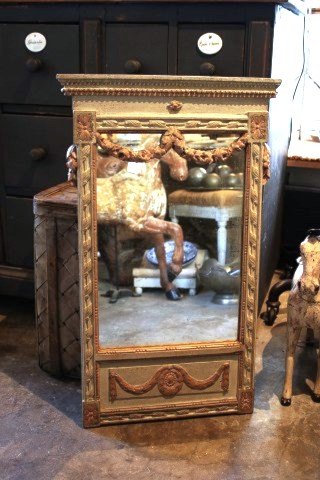 Svensk spejl i gustaviansk stil fra omkring år 1840 med fin dekoreret ramme i sart grå / grøn farve og med originalt spejlglas.
